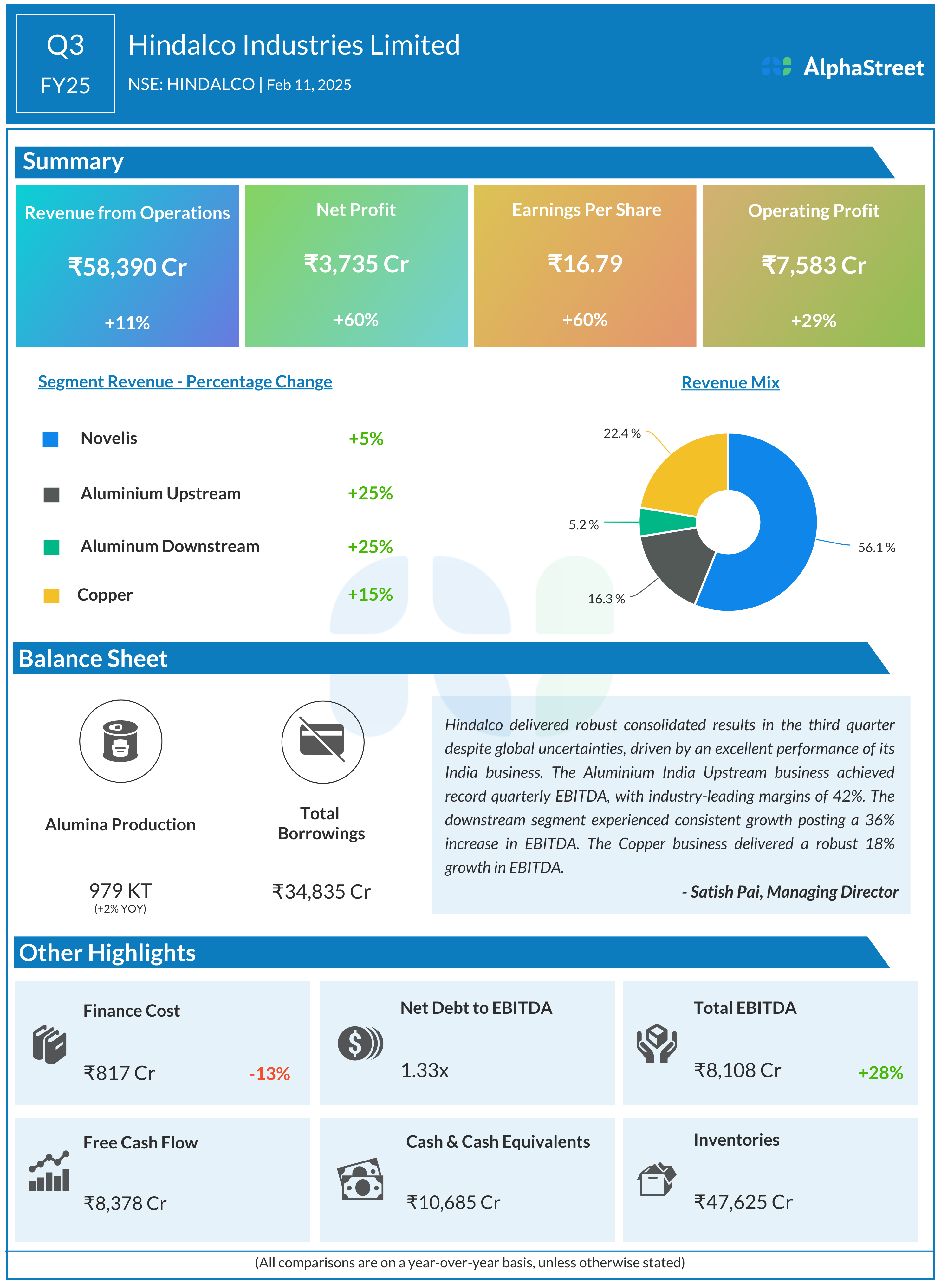 Hindalco Industries Ltd reported Revenues for Q3FY25 of ₹58,390.00 Crores up from ₹52,808.00 Crore year on year, a rise of 10.57%.