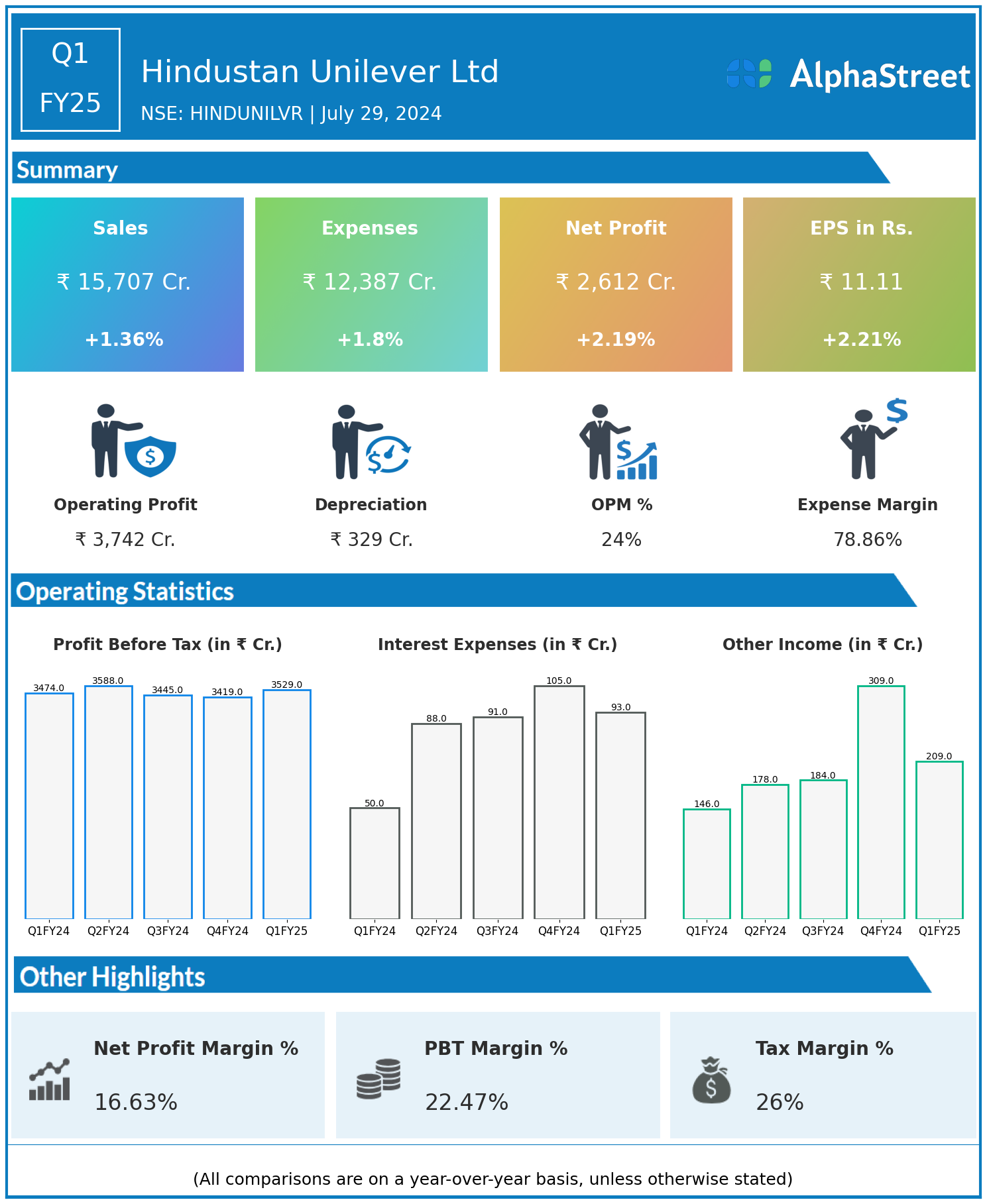 Total Expenses for Q1FY25 of ₹12,387.00 Crores up from ₹12,168.00 Crores year on year, a rise of 1.8%.