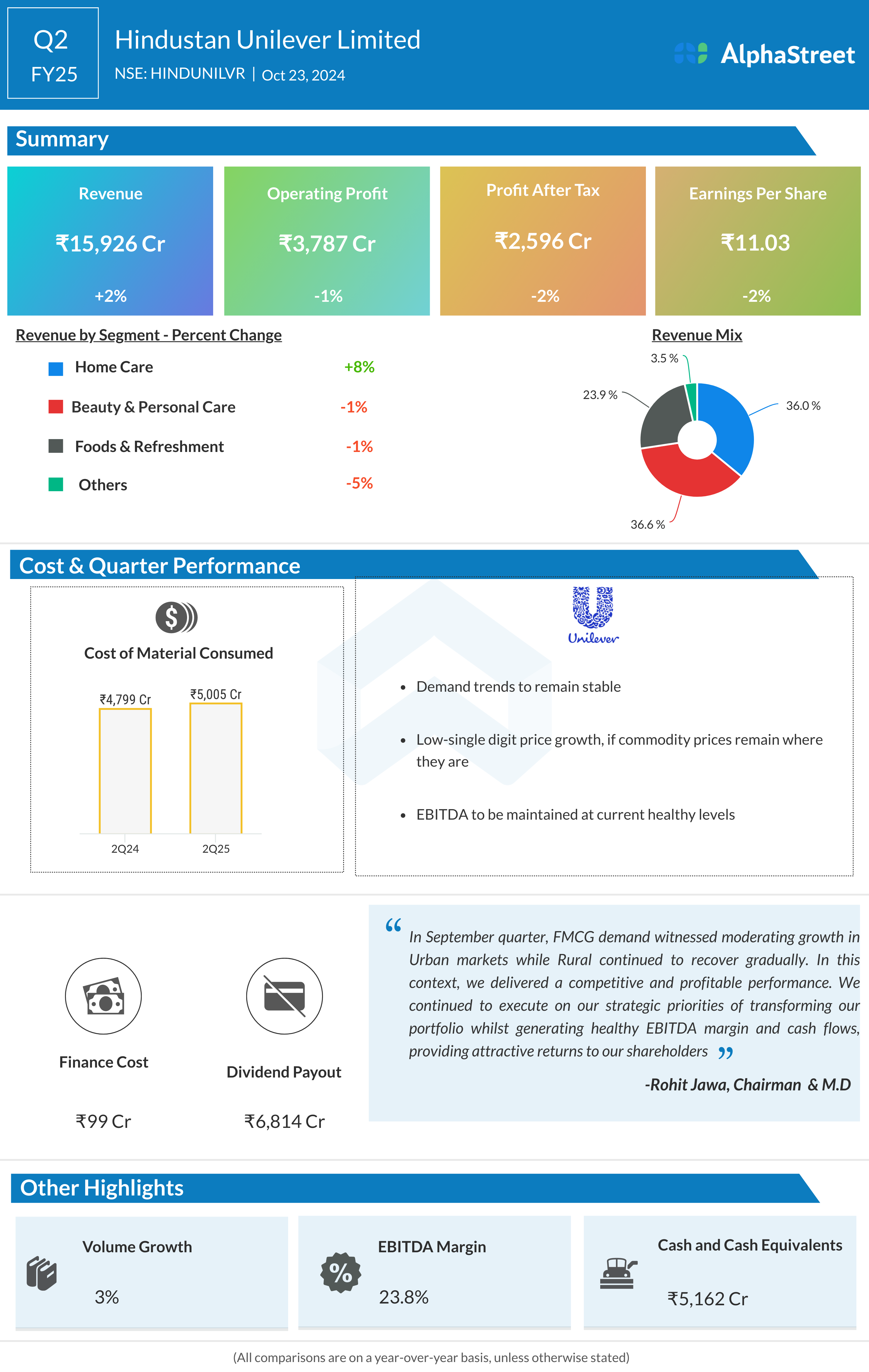 Hindustan Unilever Ltd reported Revenues for Q2FY25 of ₹15,926.00 Crores up from ₹15,623.00 Crore year on year, a rise of 1.94%.