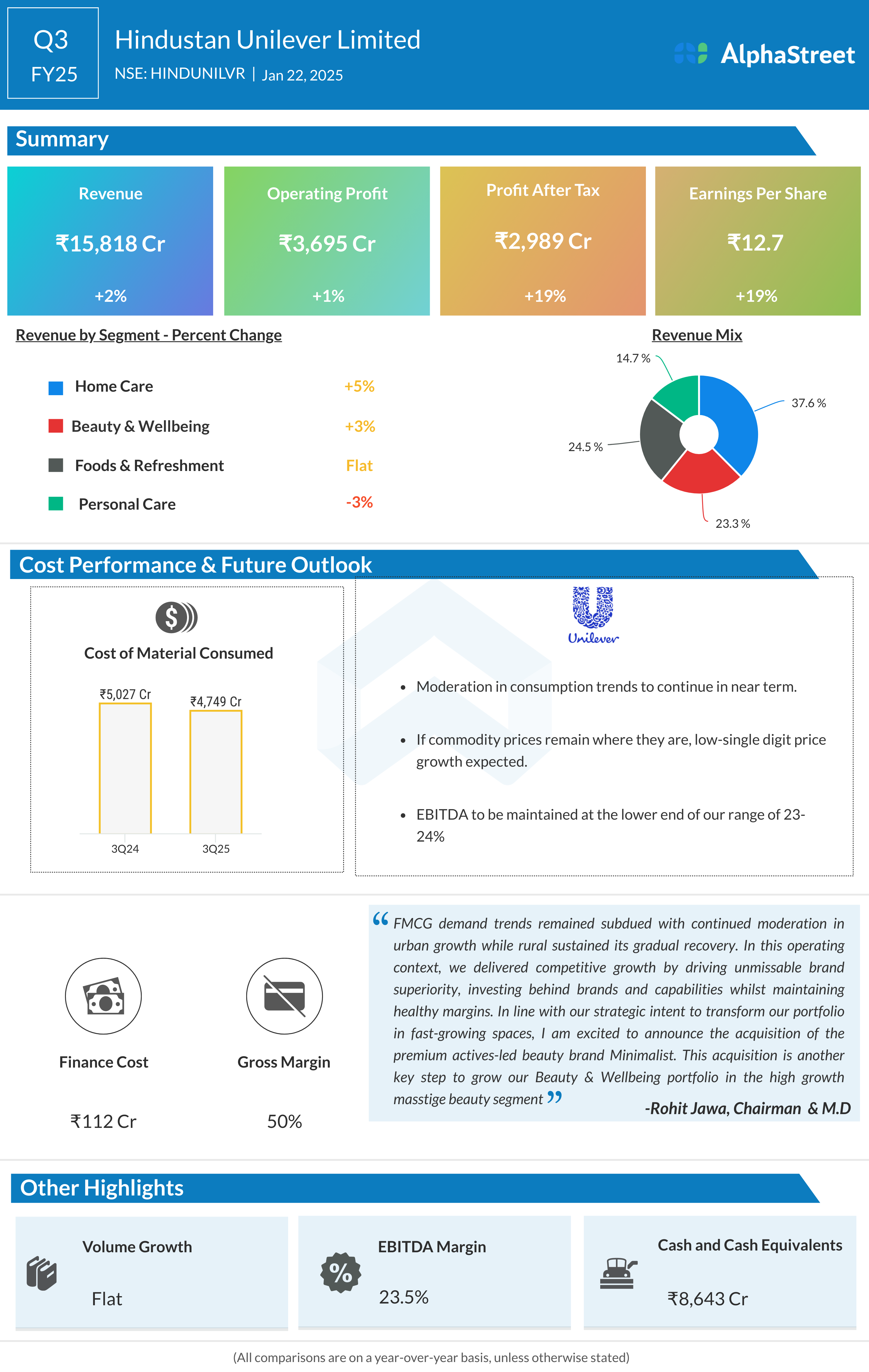 Hindustan Unilever Ltd reported Revenues for Q3FY25 of ₹15,818.00 Crores up from ₹15,567.00 Crore year on year, a rise of 1.61%.