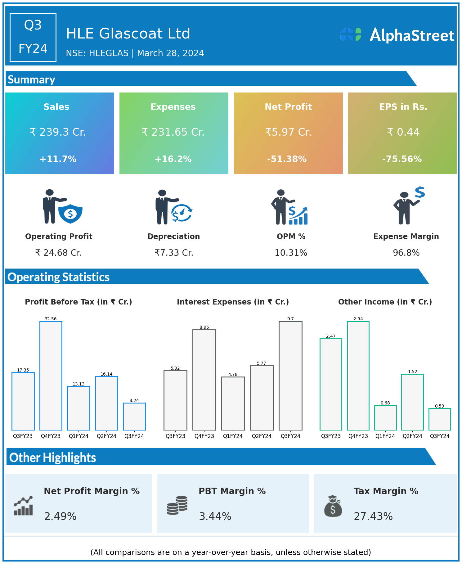 HLE Glascoat Ltd reported Revenues for Q3FY24 of ₹239.30 Crores up from ₹214.23 Crore year on year, a rise of 11.7%.