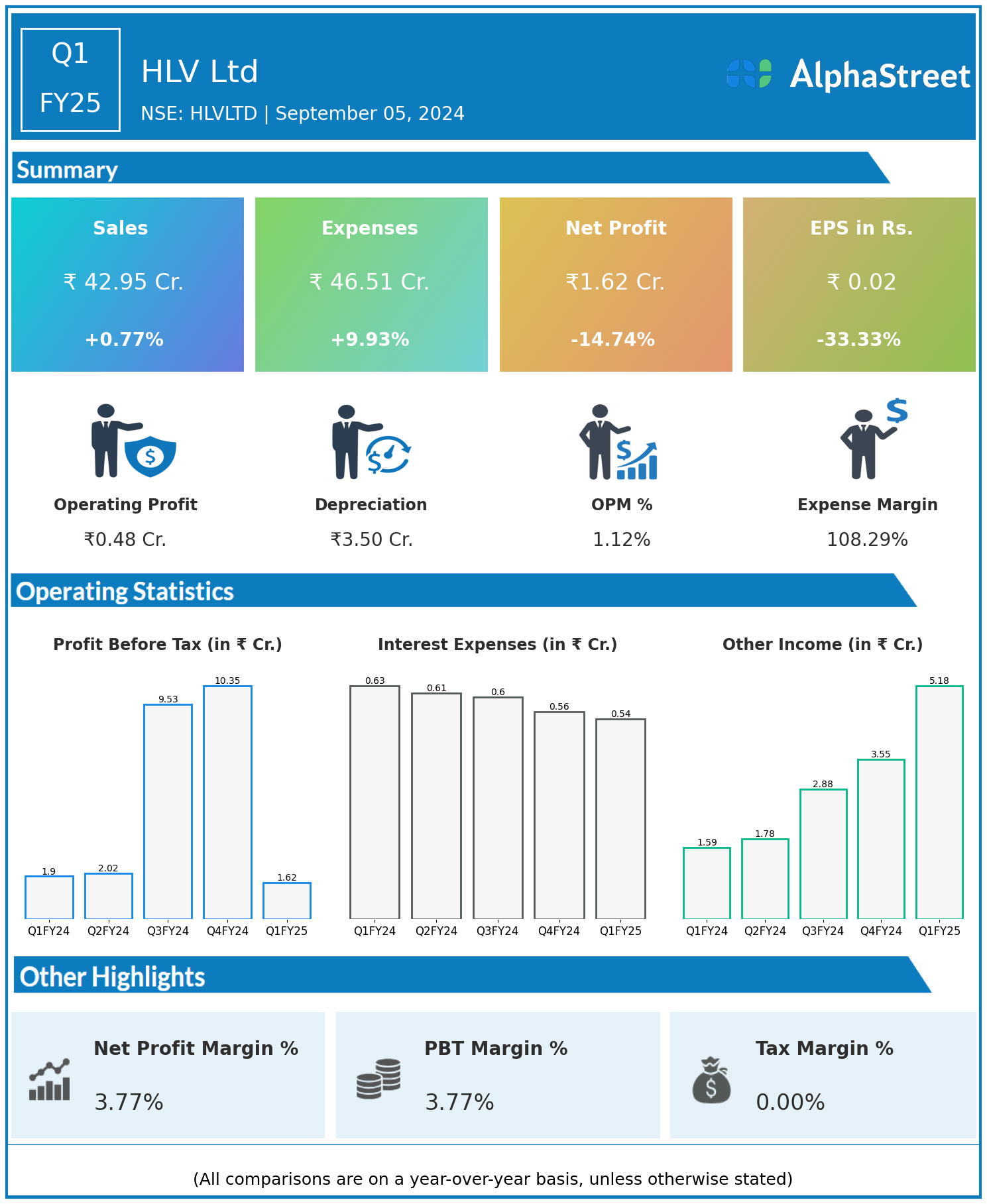 HLV Ltd reported Revenues for Q1FY25 of ₹42.95 Crores up from ₹42.62 Crore year on year, a rise of 0.77%.