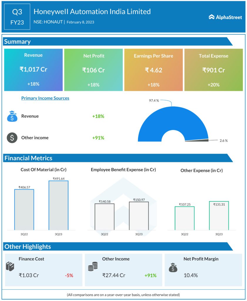 Honeywell Automation India Limited (NSE: HONAUT) reported a Revenue from Operations of ₹1,017.49 Crores, an increase of 18% growth from the previous year. The Consolidated Net Profit for the business increased by 18% year over year, to ₹106.07 Crore from ₹89.73 Crore. Earnings per Share is ₹4.62 for this quarter.