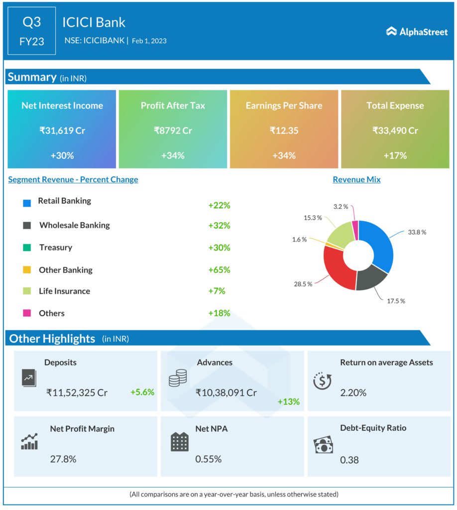 ICICI Bank Limited (NSE: ICICIBANK) posted a Revenue from operations for Q3 FY23 of ₹31,618.81 Crore up from ₹24,314.25 Crore year on year, a growth of 30%. Consolidated Net Profit was ₹8,792.42 Crore, a growth of 34.5% compared to same quarter of the previous year. The Earnings per Share is ₹12.35 for this quarter.