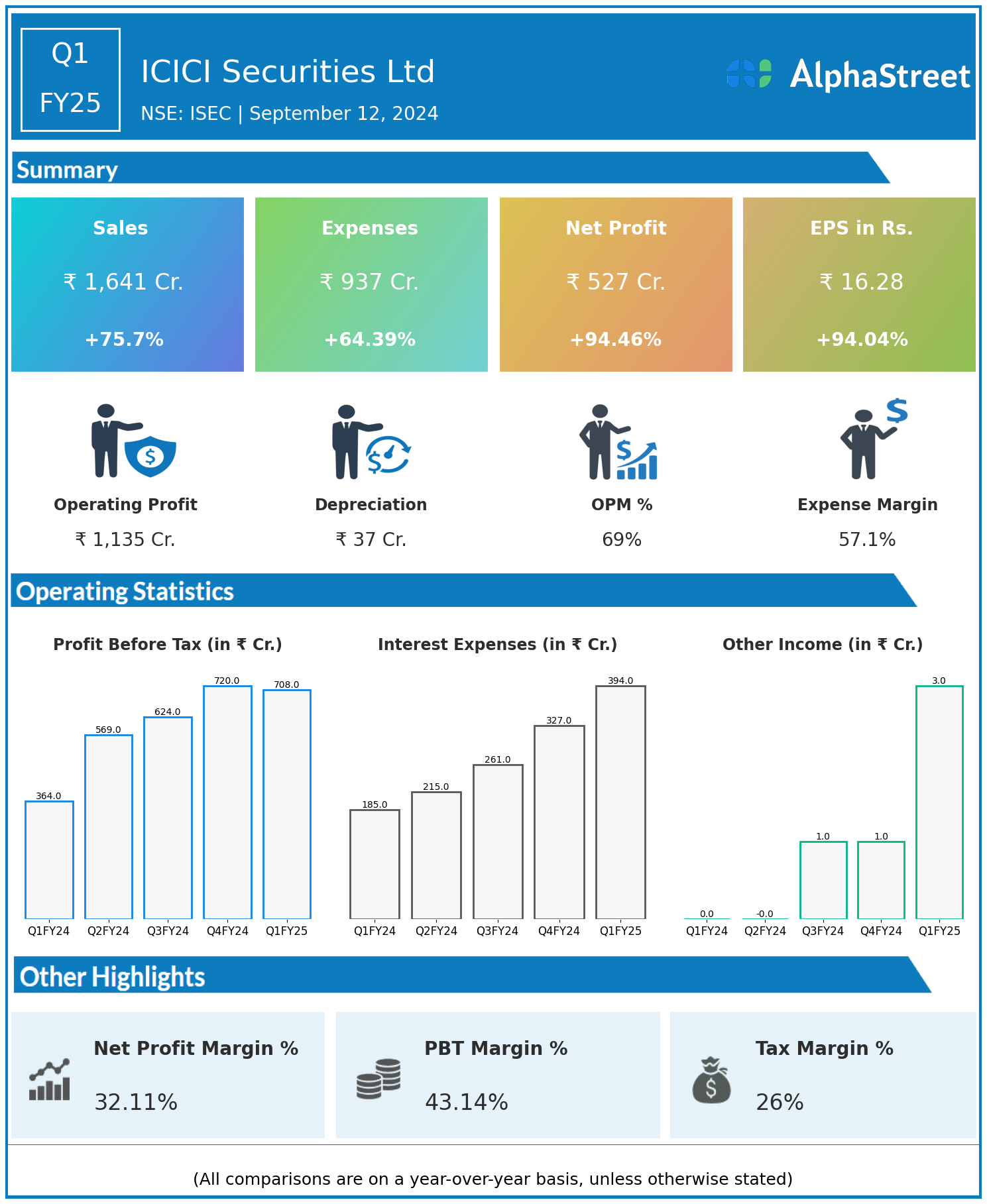 ICICI Securities Ltd reported Revenues for Q1FY25 of ₹1,641.00 Crores up from ₹934.00 Crore year on year, a rise of 75.7%.