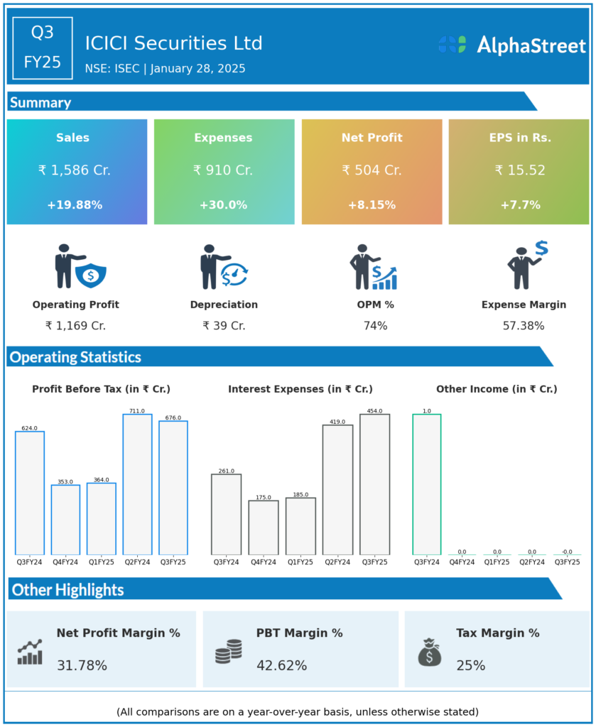 ICICI Securities Ltd reported Revenues for Q3FY25 of ₹1,586.00 Crores up from ₹1,323.00 Crore year on year, a rise of 19.88%.