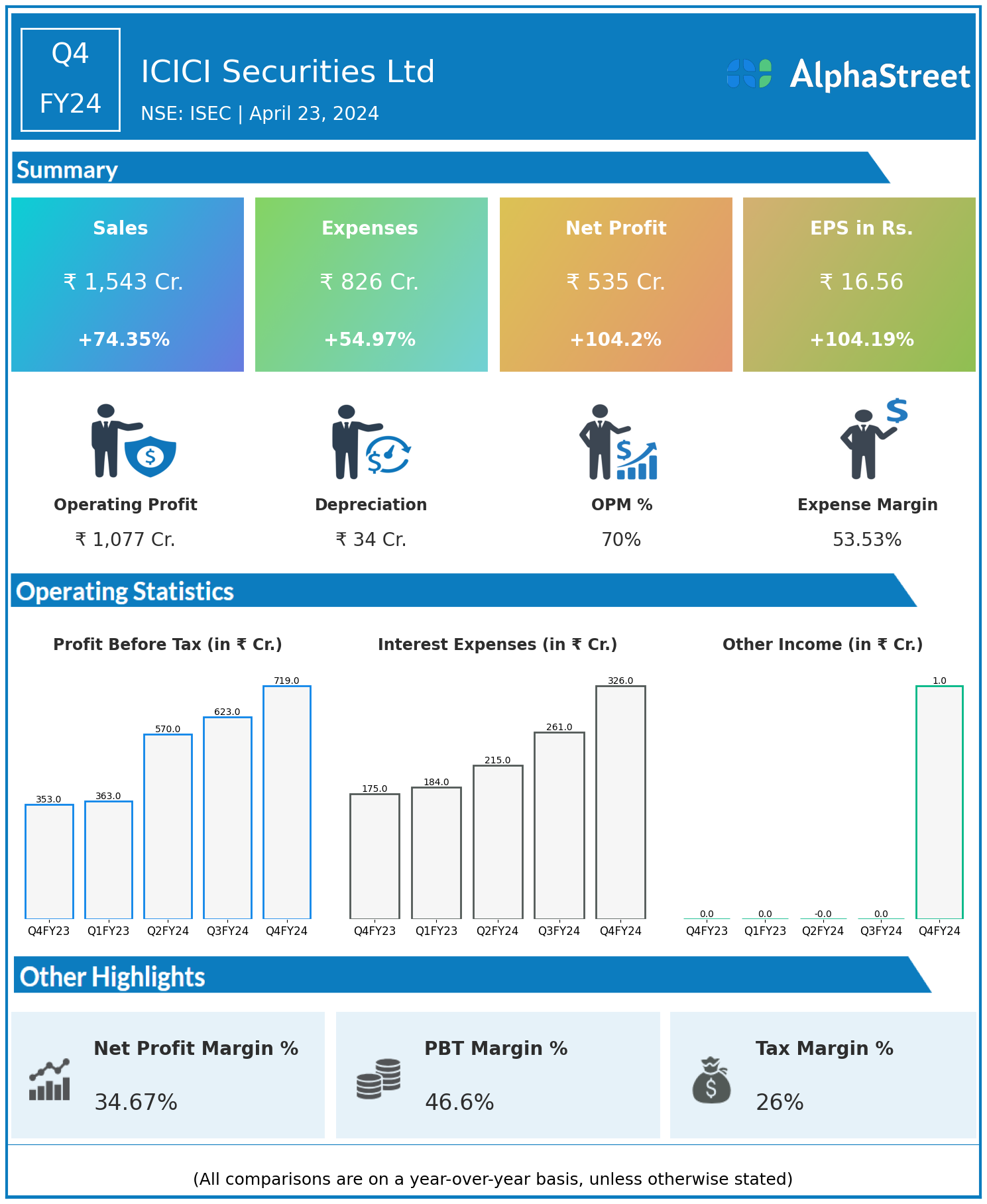 ICICI Securities Ltd reported Revenues for Q4FY24 of ₹1,543.00 Crores up from ₹885.00 Crore year on year, a rise of 74.35%.