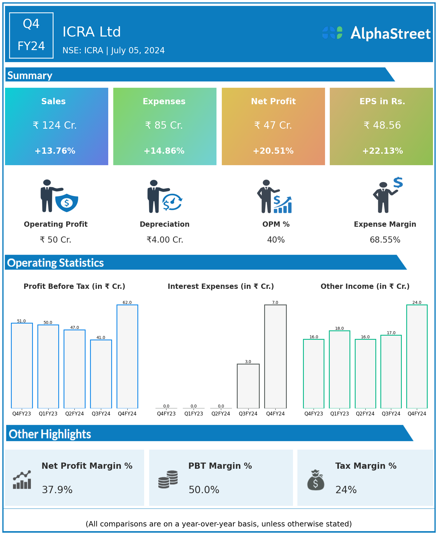 ICRA Ltd reported Revenues for Q4FY24 of ₹124.00 Crores up from ₹109.00 Crore year on year, a rise of 13.76%.