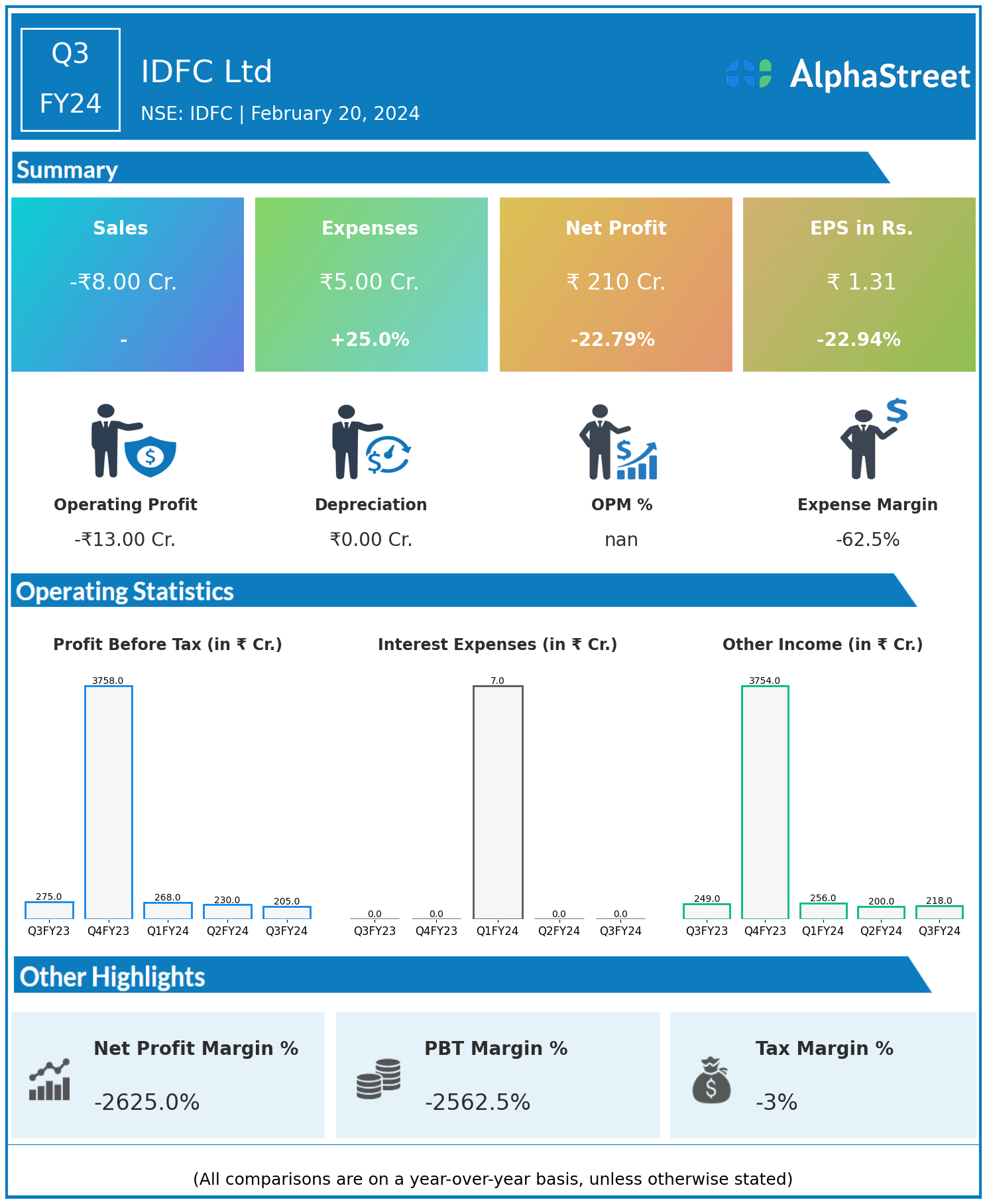 IDFC Ltd reported Revenues for Q3FY24 of -₹8.00 Crores down from ₹30.00 Crore year on year.