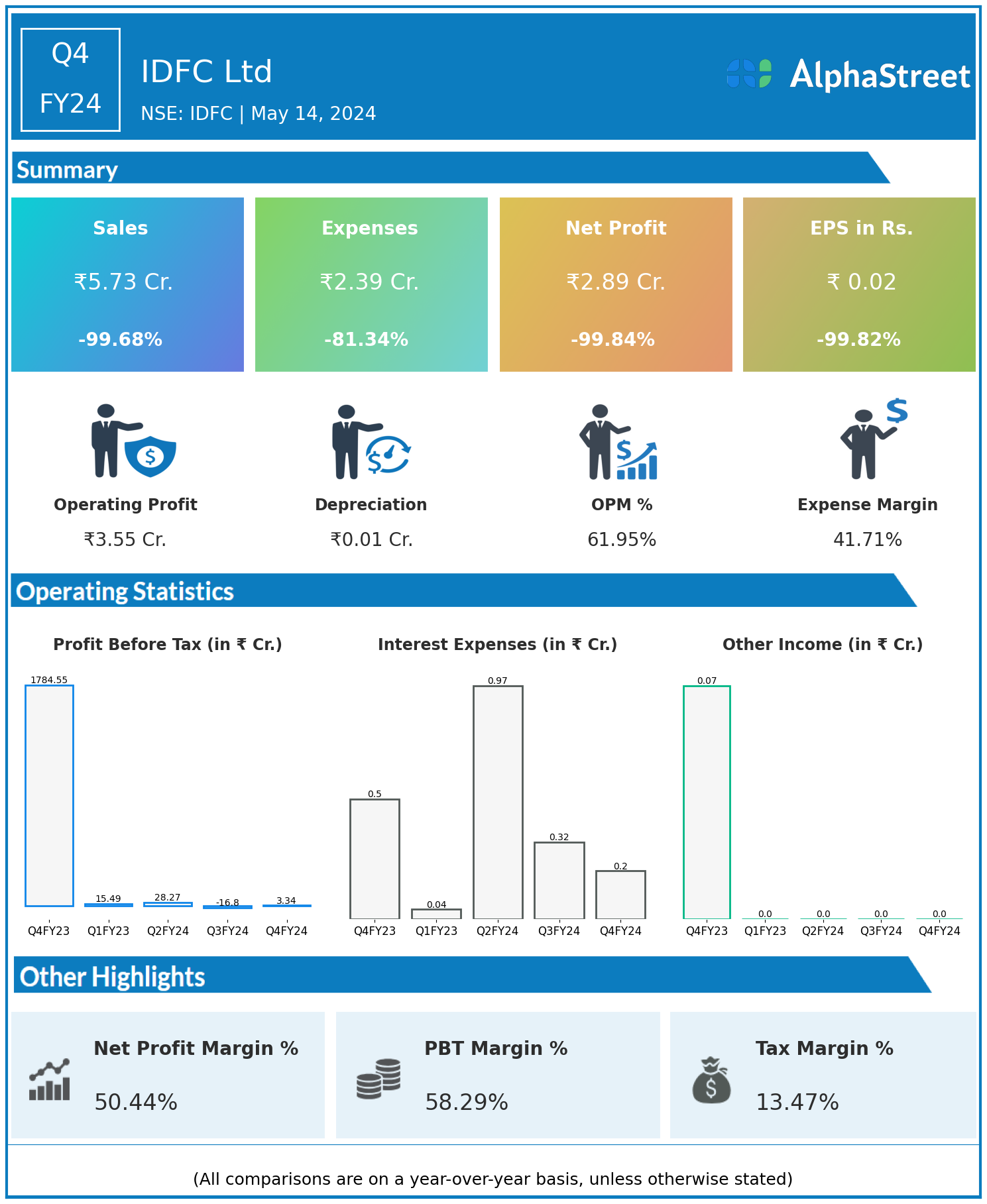 IDFC Ltd reported Revenues for Q4FY24 of ₹5.73 Crores down from ₹1,797.29 Crore year on year, a fall of 99.68%.