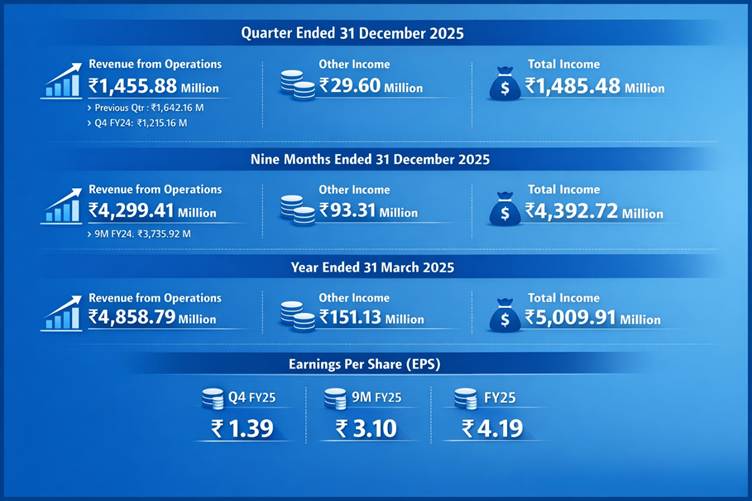 For the nine months ended 31 December 2025, revenue from operations was ₹4,299.41 million, as against ₹3,735.92 million in the same period last year. Other income during this period was ₹93.31 million, taking total income to ₹4,392.72 million.