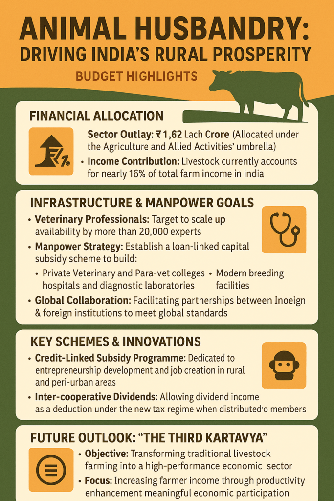 - The broader “Agriculture and Allied Activities” sector, which encompasses animal husbandry, has been allocated ₹1,62,671 crore in the 2026-27 budget. This funding is part of a total estimated expenditure of ₹53.5 lakh crore for the fiscal year.