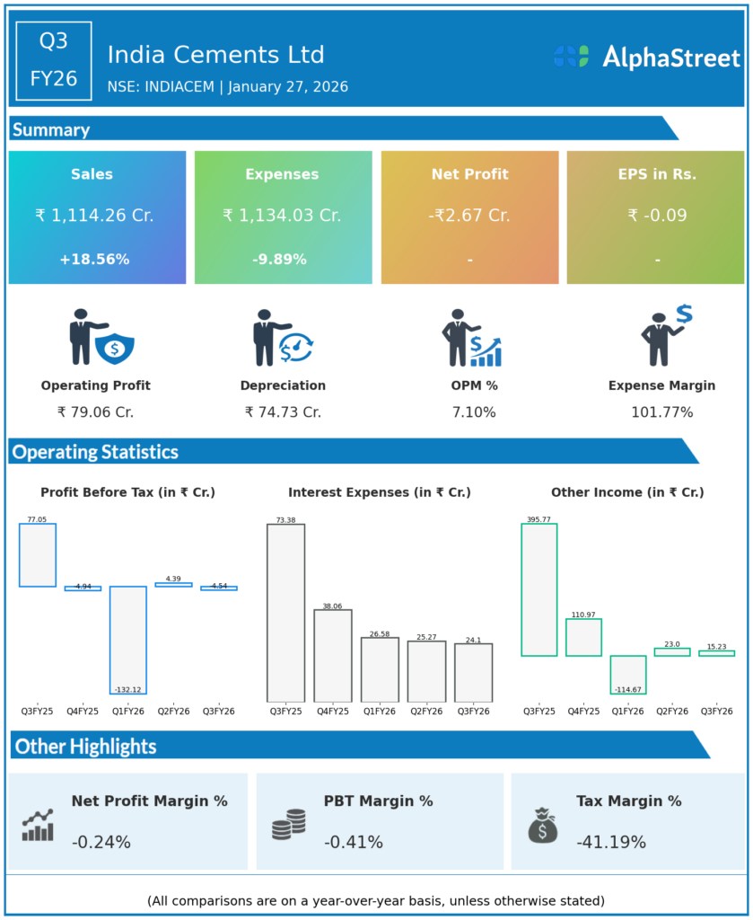 India Cements Ltd reported Q3FY26 revenues of ₹1,114.26 crore, up 18.56% YoY, but swung to consolidated net loss of ₹2.67 crore from ₹118.63 crore profit. Total expenses fell 9.89% YoY to ₹1,134.03 crore amid revenue expansion.