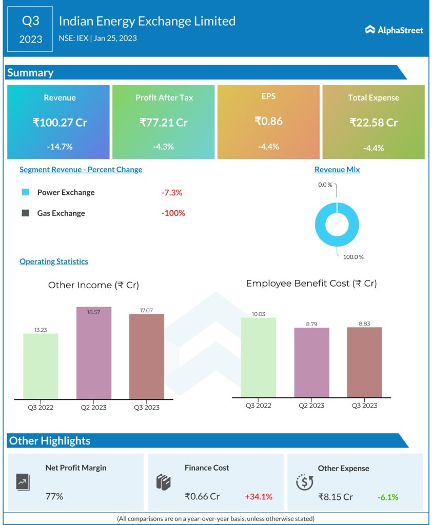 Indian Energy Exchange Limited (NSE: IEX) reported a Revenue from Operations of ₹100.27 Crores, a decline of 14.7% growth from the previous year. The Consolidated Net Profit for the business increased by -4..3% year over year, to ₹77.21 Crore. Earnings per Share is ₹0.86 for this quarter.