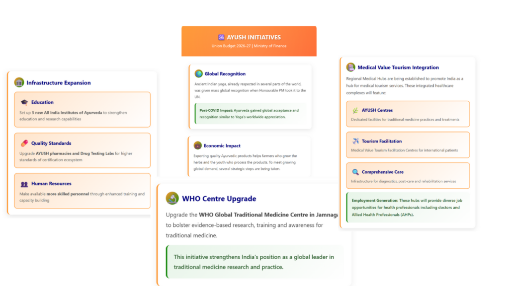 The speech linked these measures to the objective of supporting exports of quality Ayurvedic products, though it did not provide specific export targets or budgetary allocations for AYUSH. The initiatives were presented alongside broader health-sector measures, including proposals on allied health professionals, caregiver training and regional medical hubs that include AYUSH centres.