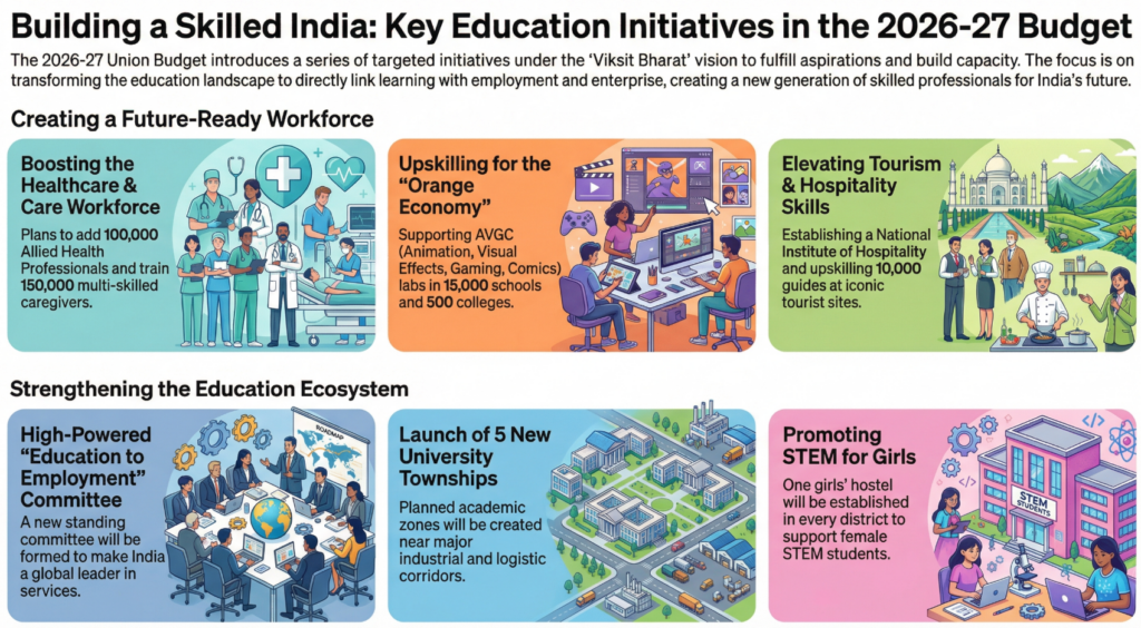 Presenting the proposals, Finance Minister Sitharaman said the government would support states, through a challenge route, in creating five University Townships near major industrial and logistics corridors. The speech said these planned academic zones would host multiple universities, colleges, research institutions, skill centres and residential complexes, with the stated aim of clustering higher education and innovation around economic corridors.