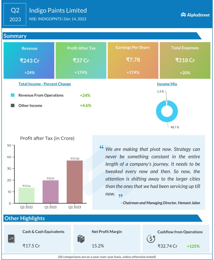 Indigo Paints Limited (NSE: INDIGOPNTS) reported Q2FY23 result with a Revenue from Operations growth of 24% up to ₹242.6 Crores from ₹196.11 Crores year on year. The Net Profit surged up to ₹37.08 Crores from ₹13.54 Crore, an increase of 174%. The Earnings per share is ₹7.78 for this quarter.