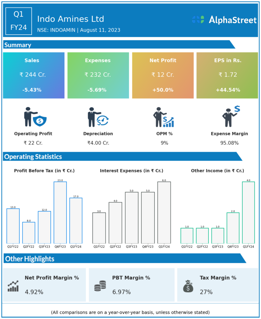 - Indo Amines Ltd reported Revenues for Q1FY24 of ₹244.00 Crores down from ₹258.00 Crore year on year, a fall of 5.43%.