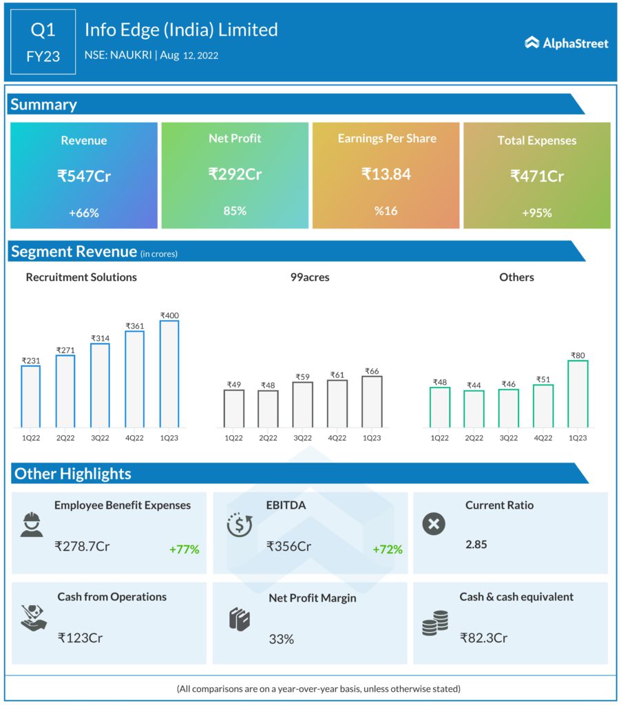 Info Edge (India) Limited (NSE: NAUKRI) reported its Q1FY23 results. Net profit increased by 85% year over year from 157.6 crores to 292.4 crores. The business reported consolidated revenue of 547.2 crore, an increase of 66% from the previous year. The recruitment solutions business whose revenue increased by 68%, was the primary driver of revenue growth. The earnings per share for this quarter is ₹13.84.