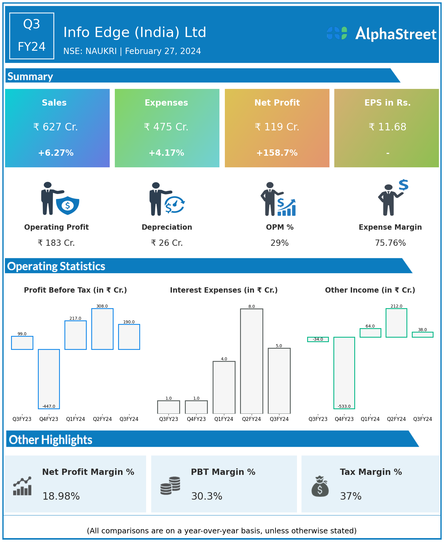 Info Edge (India) Ltd reported Revenues for Q3FY24 of ₹627.00 Crores up from ₹590.00 Crore year on year, a rise of 6.27%.