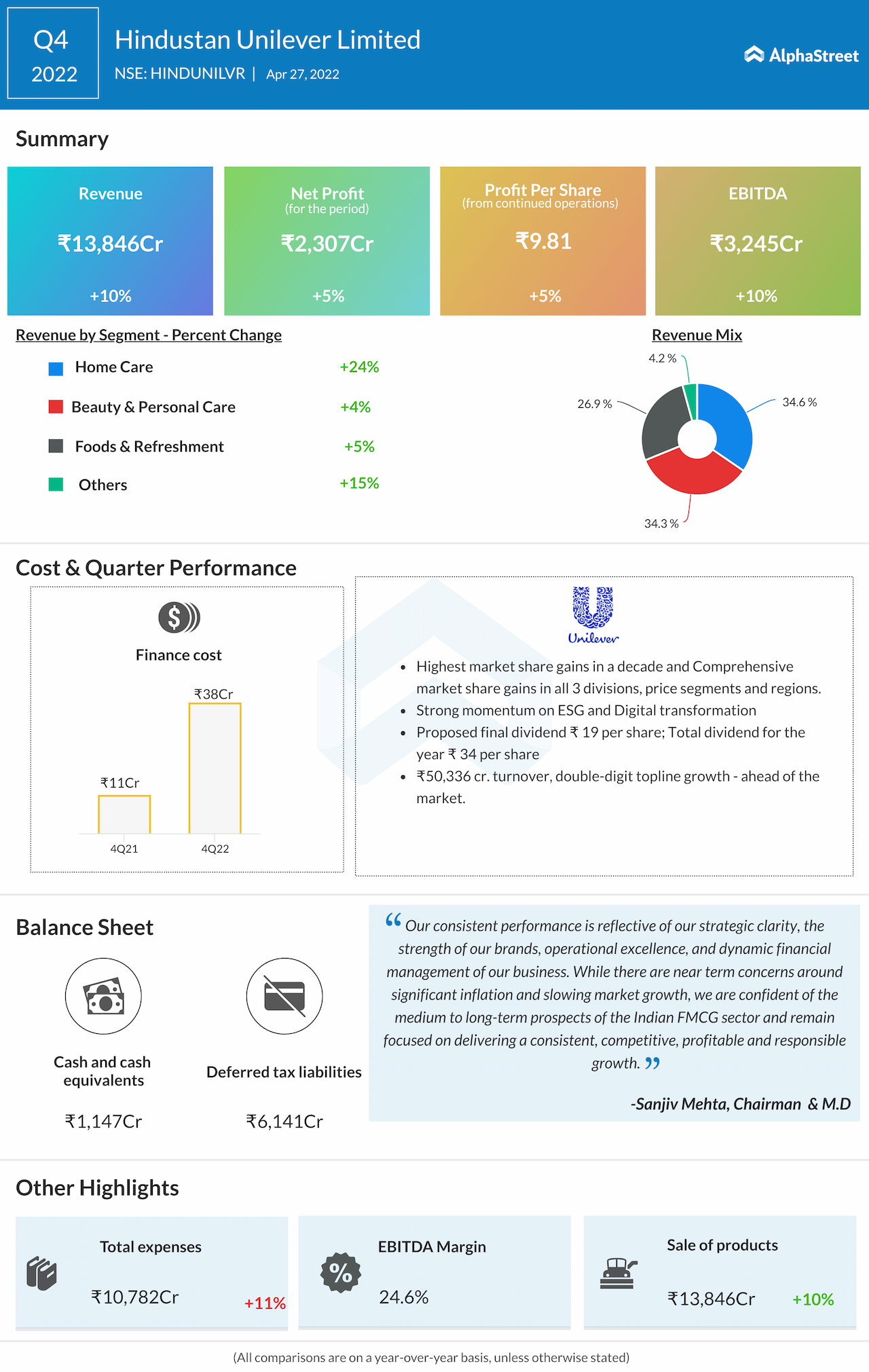 FMCG giant Hindustan Unilever Limited(NSE: HINDUNILVR) reported its fourth-quarter 2022 earnings.