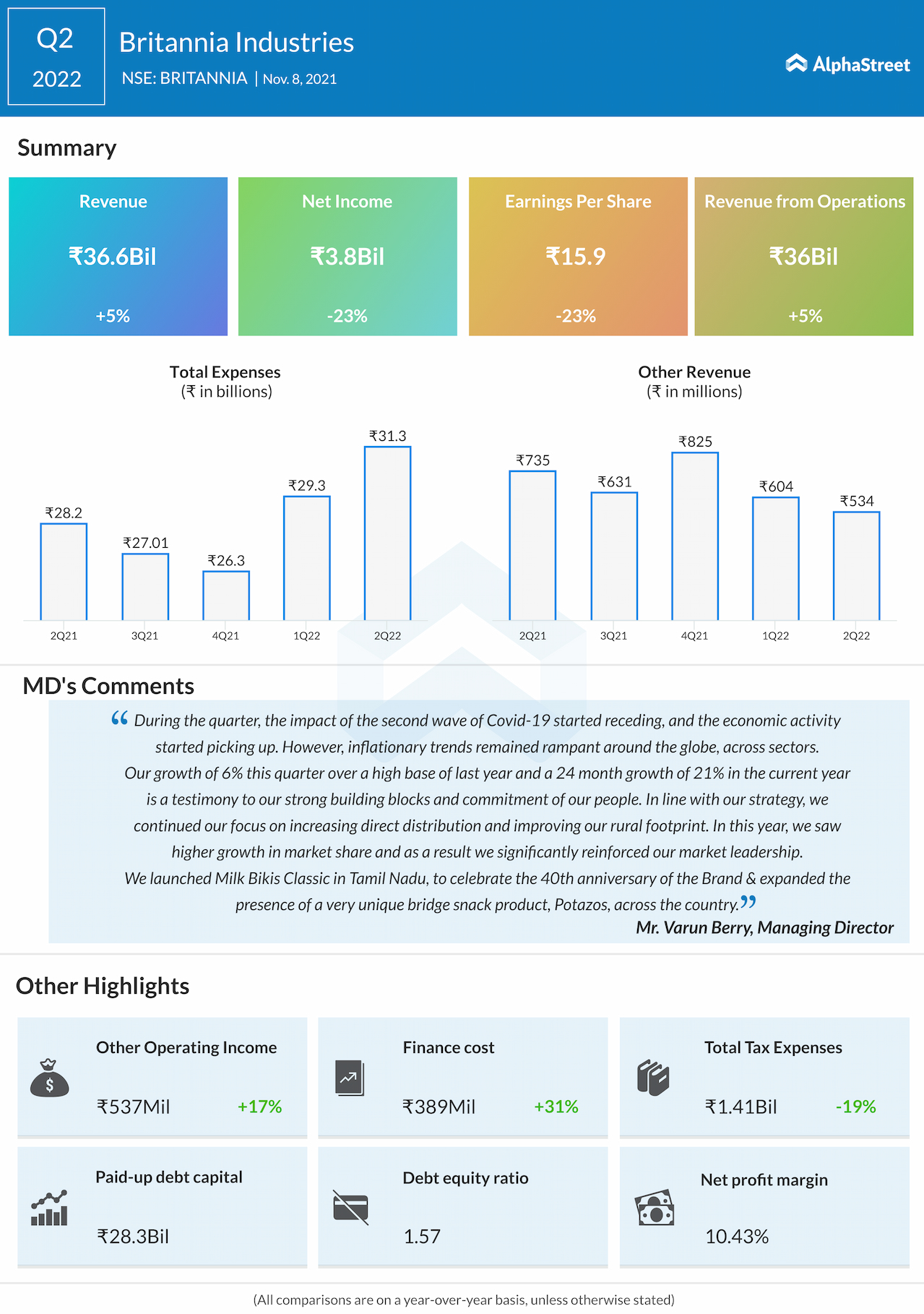 Britannia Industries Limited (NSE: BRITANNIA) posted its second-quarter 2022 results today after market hours.