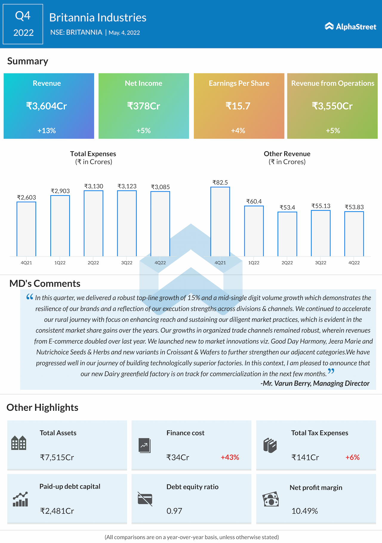Britannia Industries Limited (NSE: BRITANNIA) posted its fourth-quarter 2022 results.
