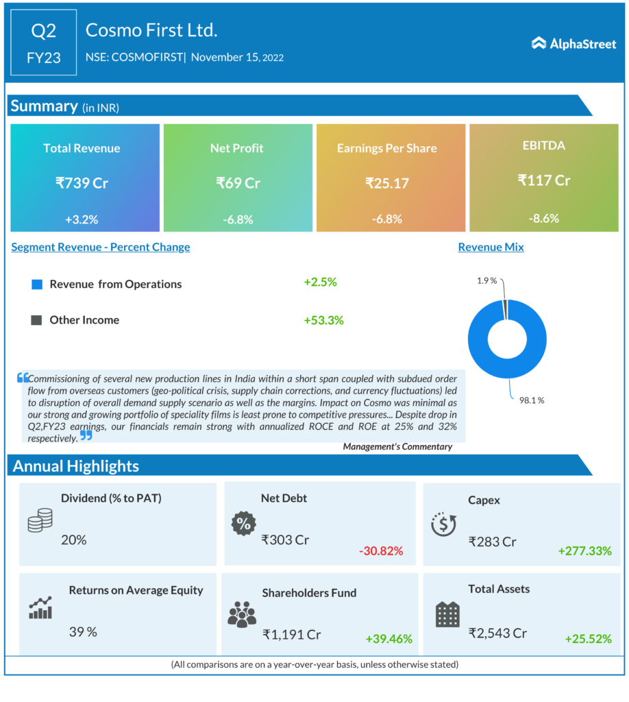 Cosmo First Ltd. (NSE: COSMOFIRST) posted its second-quarter fiscal 2023 earnings results.