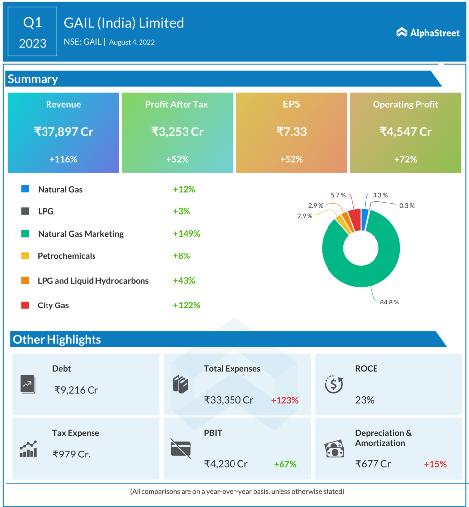 On Thursday, GAIL reported a 90.5% jump in its June quarter net profit at ₹2,915 crore. The rise in year-on-year profit was on the back of bumper earnings from natural gas marketing. The company had posted a net profit of ₹1.530 crore for the year-ago period.