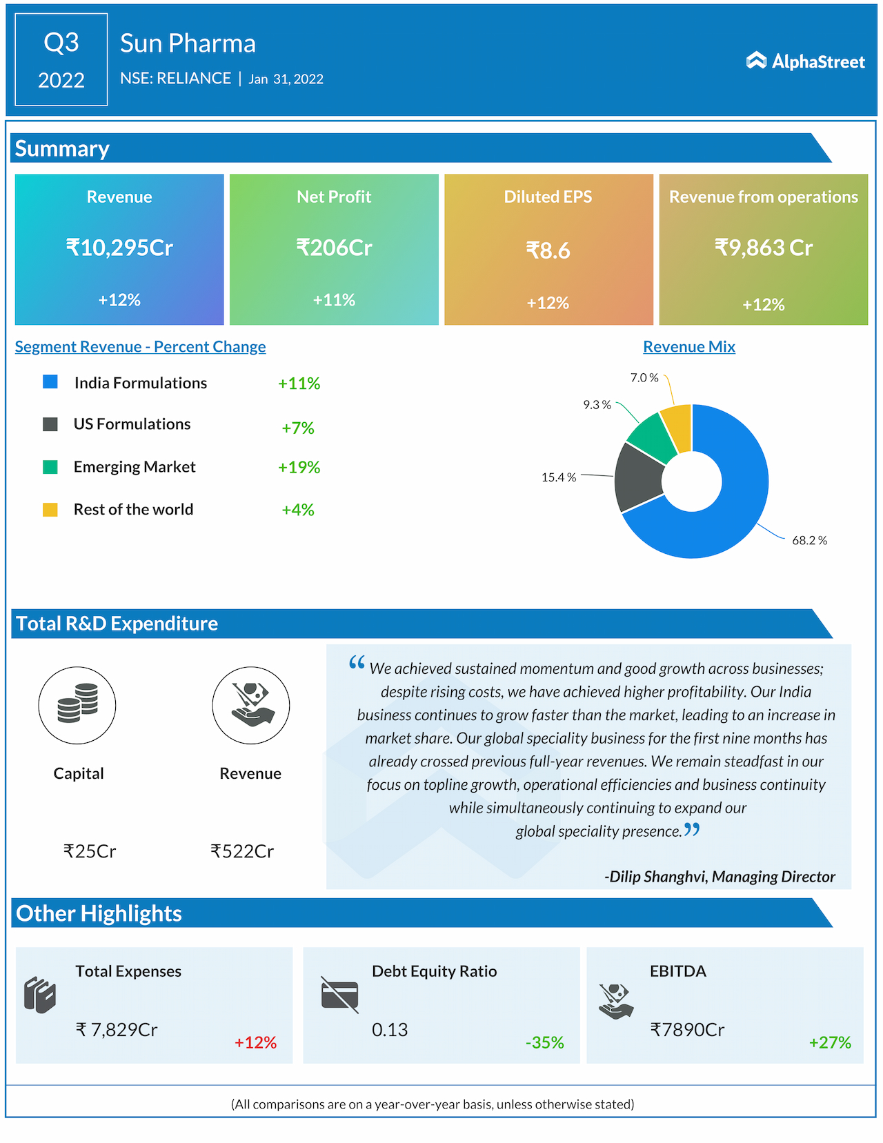 Sun Pharmaceutical Industries (NSE: SUNPHARMA) reported its third-quarter 2022 earnings results today.