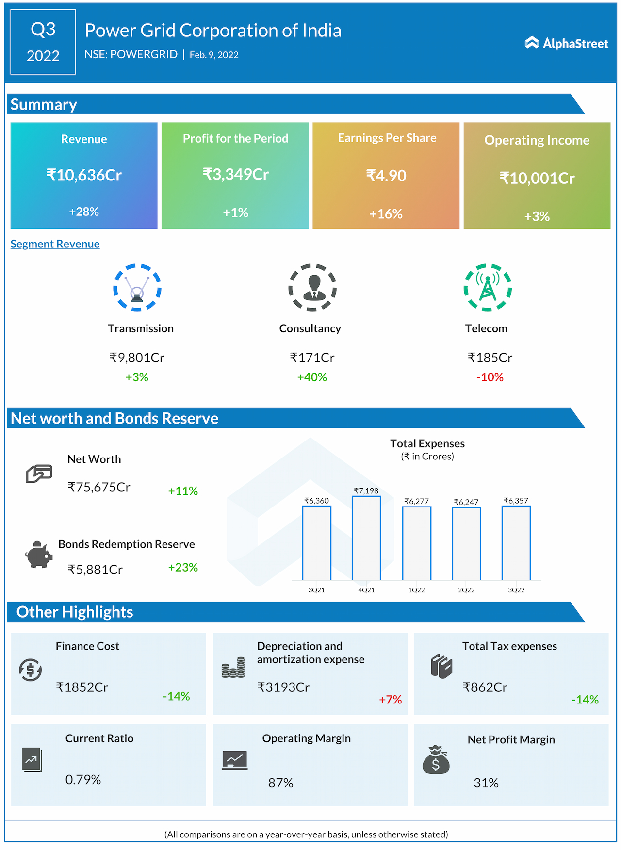 Power Grid had a total profit of ₹3,349 crores or ₹4.90 per share compared to ₹3,324 crores or ₹4.22 per share in the previous year of the same quarter.