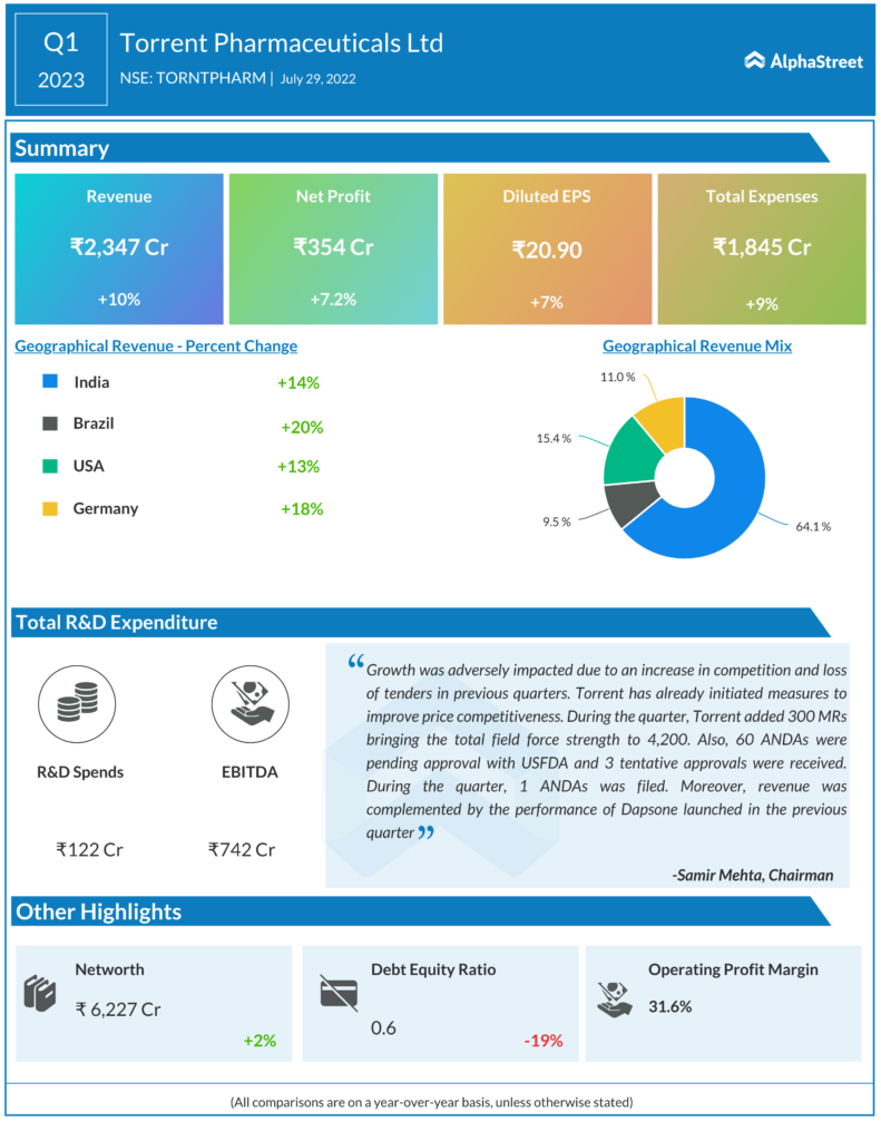 In the United States, revenue was up by 13 percent and stood at Rs 299 crores. The company also announced that as of June 30, 2022. In Germany, revenue was down by 18 percent and stood at Rs 214 crores. The company said it has appointed Aman Mehta, son of Torrent Pharma Chairman Samir Mehta, as Director on the company’s board with effect from August 1, 2022.