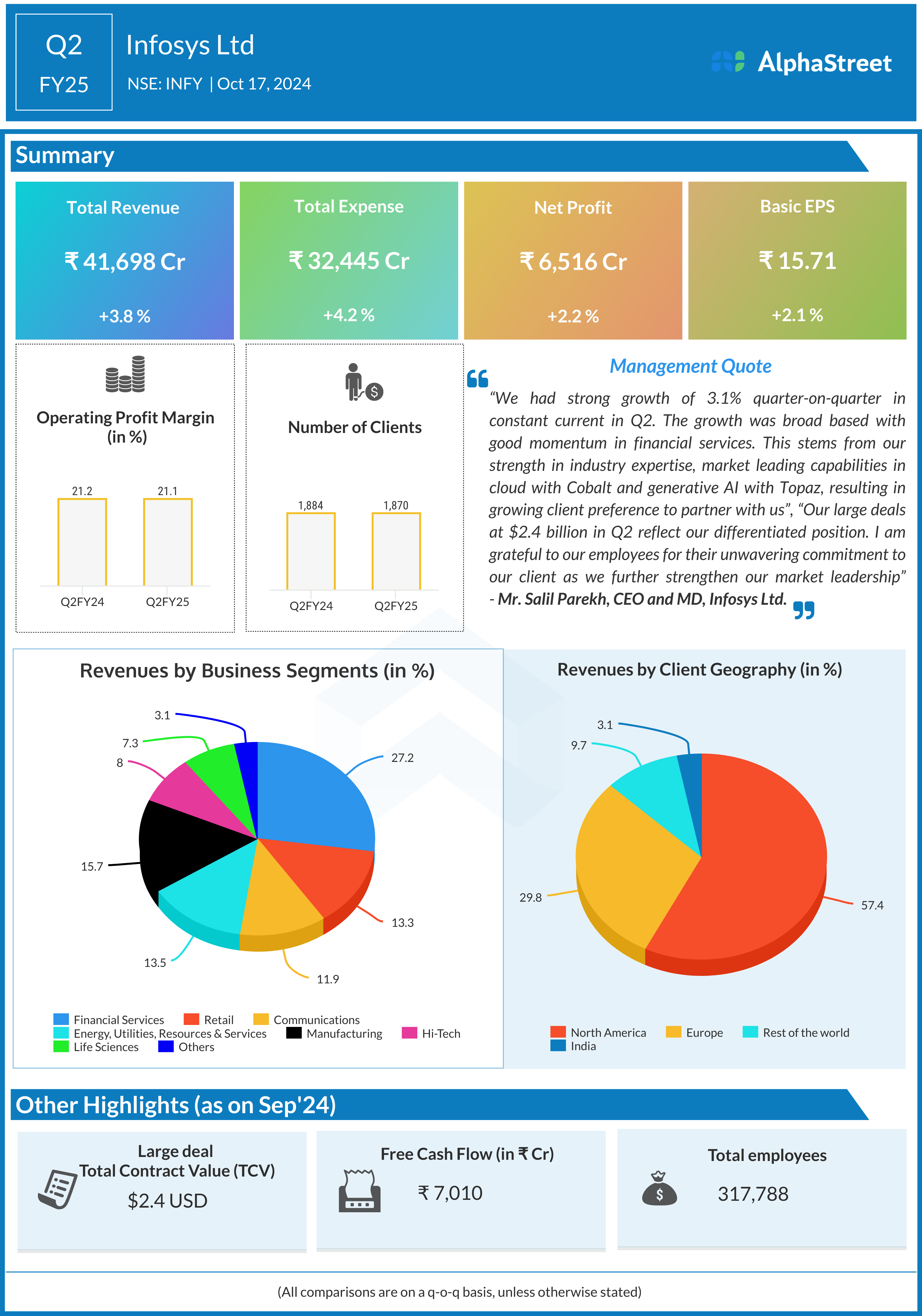 Infosys Ltd reported a Total Revenue for Q2FY25 of ₹ 41,698 Crore up from ₹40,153 Crore quarter on