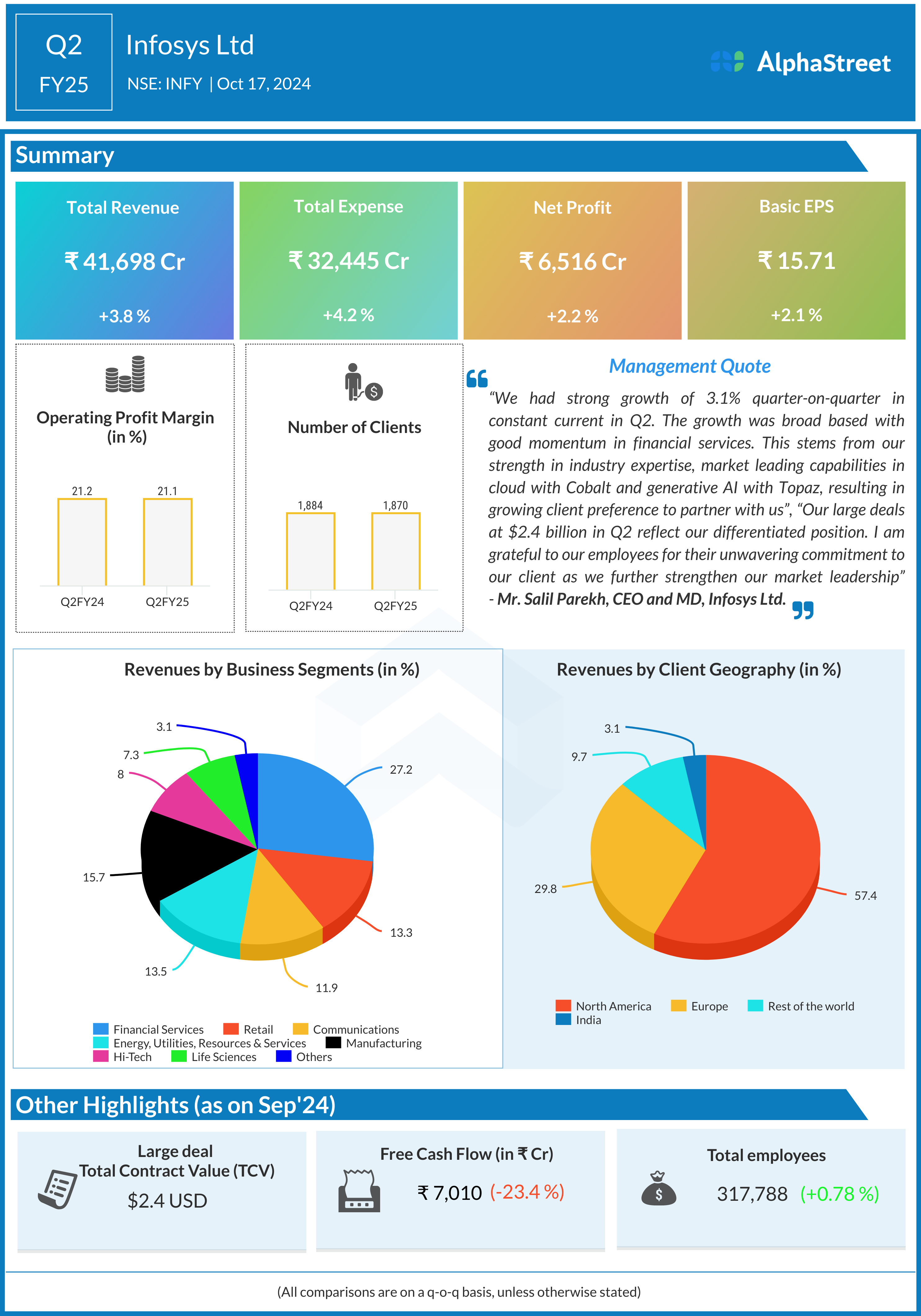 Infosys Ltd reported a Total Revenue for Q2FY25 of ₹ 41,698 Crore up from ₹40,153 Crore quarter on quarter, a rise of 3.8%.