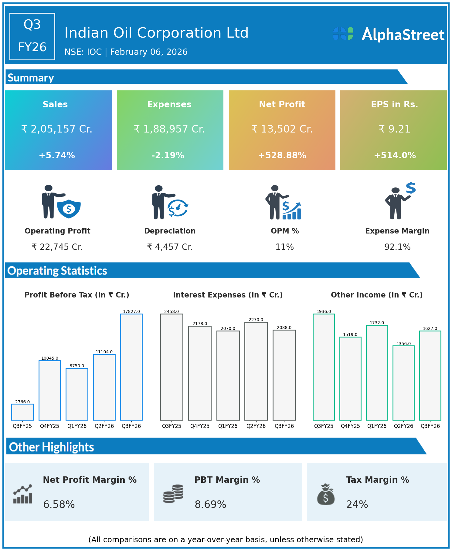 Indian Oil Corporation Ltd reported Q3 FY26 consolidated revenues of ₹2,05,157 crore, up 5.74% YoY from ₹1,94,014 crore. Net profit leaped 528.88% YoY to ₹13,502 crore from ₹2,147 crore, driving EPS to ₹9.21, a 514.00% YoY rise. Expense reduction fueled the dramatic turnaround.