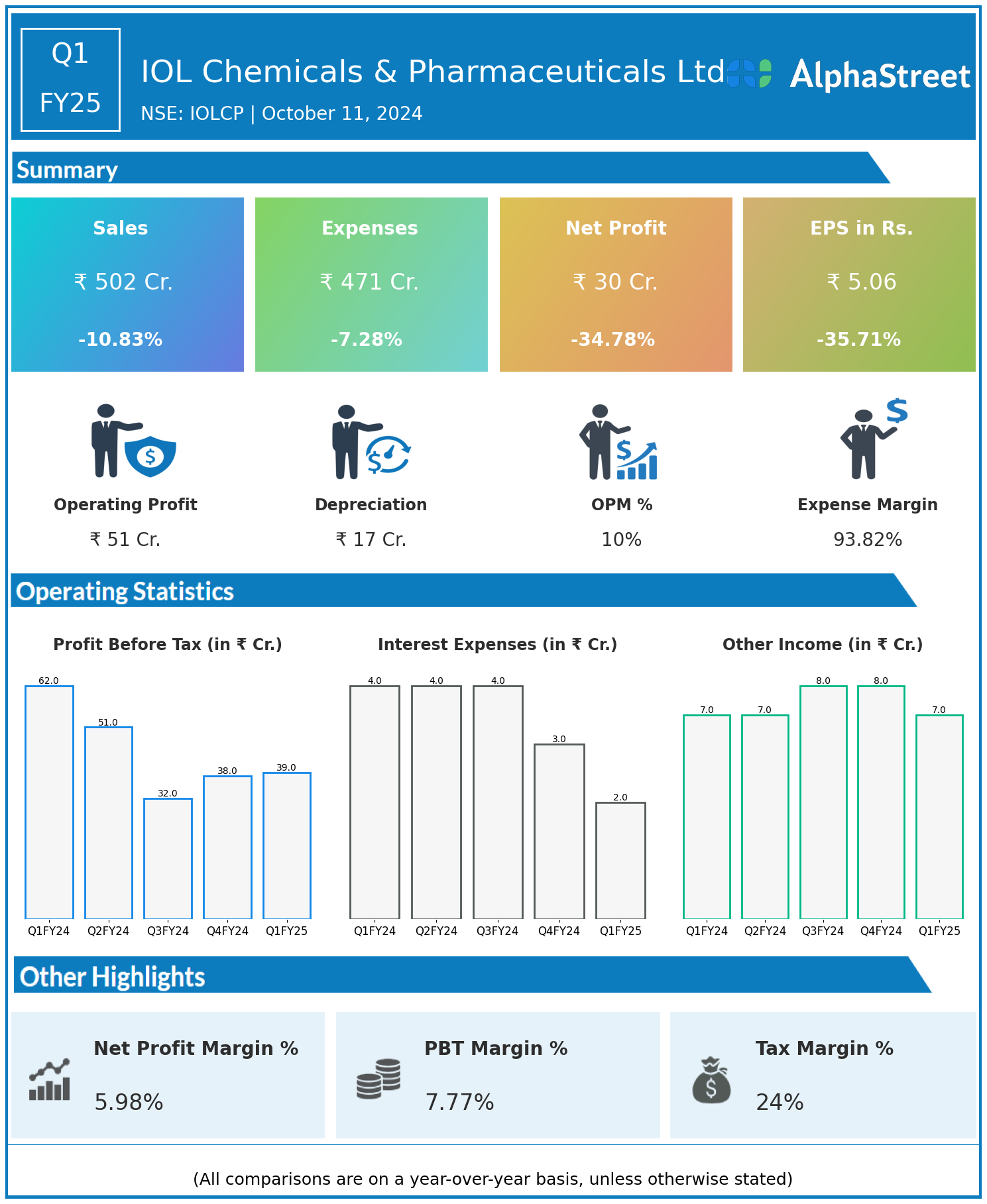 IOL Chemicals & Pharmaceuticals Ltd reported Revenues for Q1FY25 of ₹502.00 Crores down from ₹563.00 Crore year on year, a fall of 10.83%.