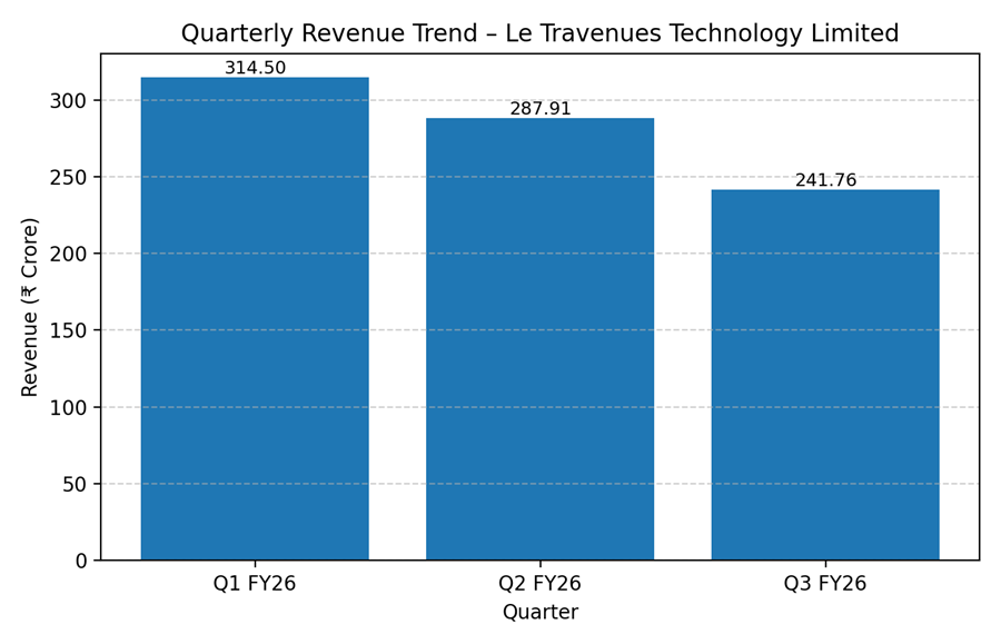 The company reported consolidated revenue across the last three quarters. Revenue for Q1 FY26 was approximately ₹314.5 crore. Q2 FY26 revenue stood at ₹287.91 crore. Q3 FY26 revenue was reported at ₹241.76 crore. Revenue performance reflects seasonal travel demand patterns.