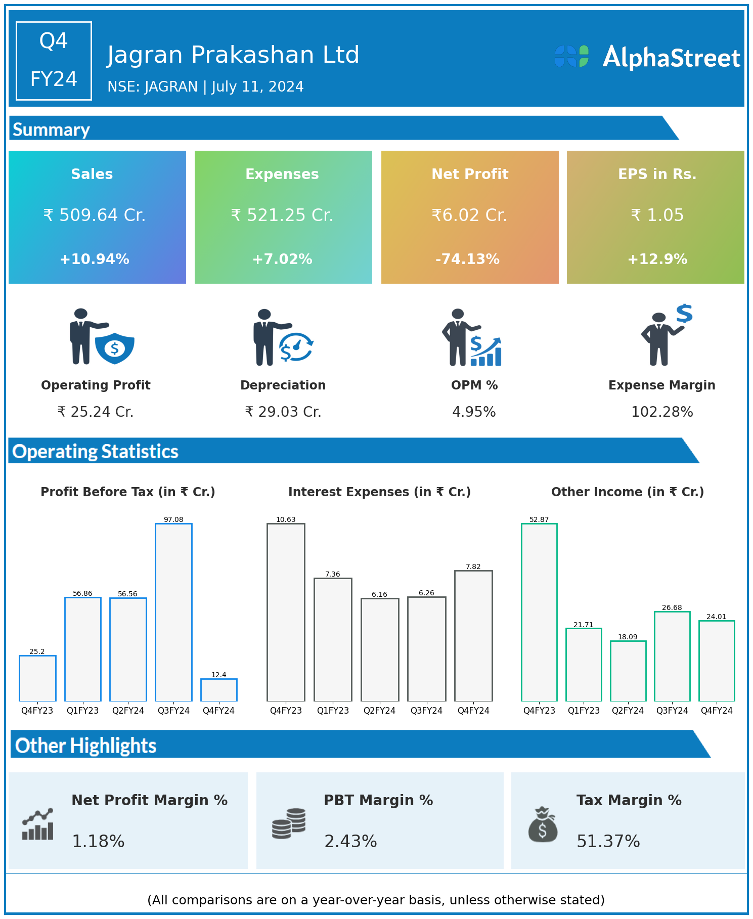 Jagran Prakashan Ltd reported Revenues for Q4FY24 of ₹509.64 Crores up from ₹459.38 Crore year on year, a rise of 10.94%.