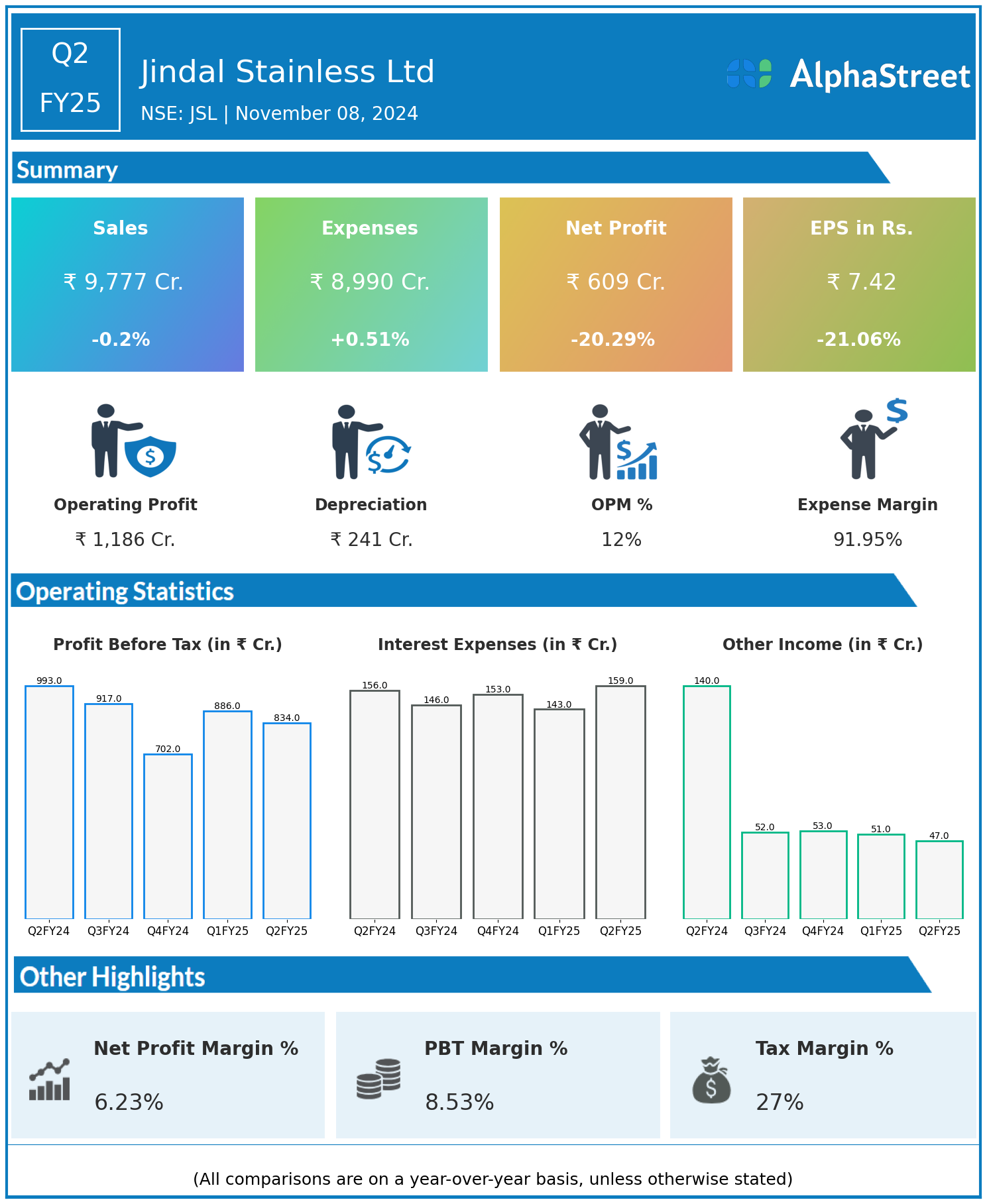 Jindal Stainless Ltd reported Revenues for Q2FY25 of ₹9,777.00 Crores down from ₹9,797.00 Crore year on year, a fall of 0.2%.