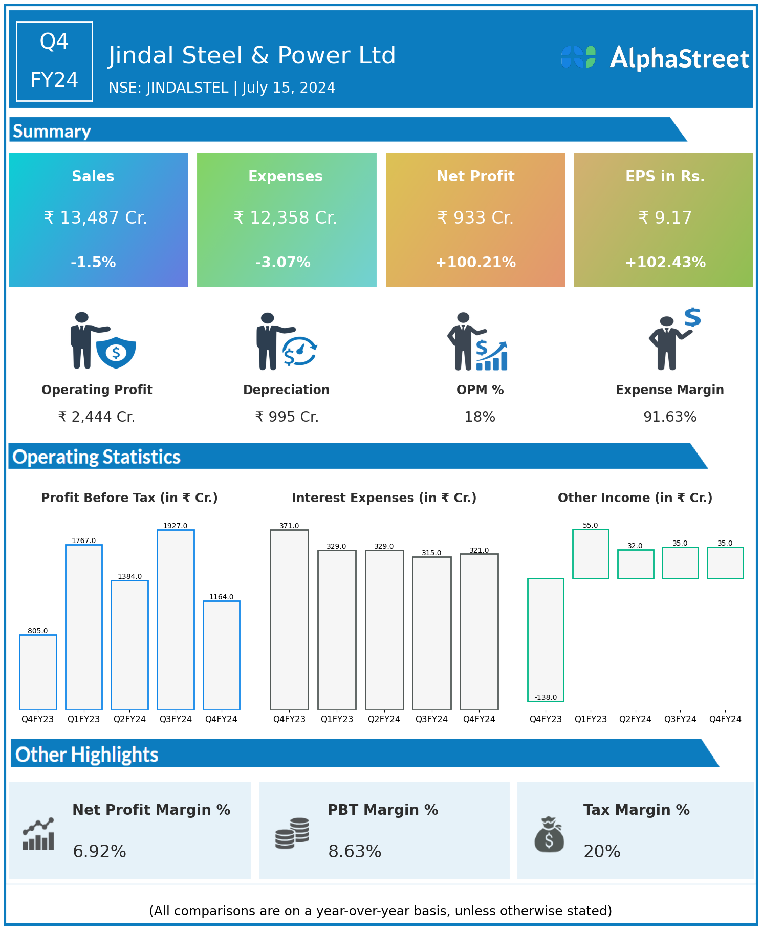 Jindal Steel & Power Ltd reported Revenues for Q4FY24 of ₹13,487.00 Crores down from ₹13,692.00 Crore year on year, a fall of 1.5%.