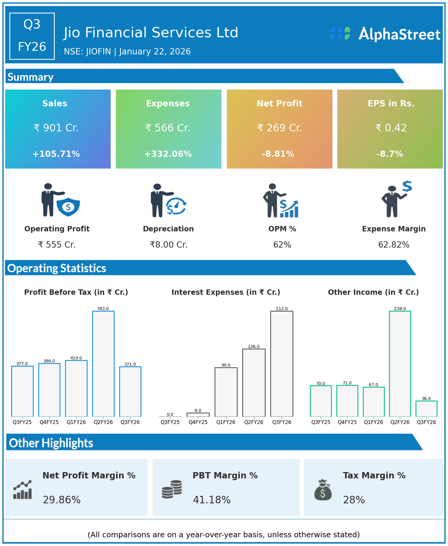 Jio Financial Services Ltd reported Revenues for Q3FY26 of ₹901.00 Crores up from ₹438.00 Crore year on year, a rise of 105.71%.