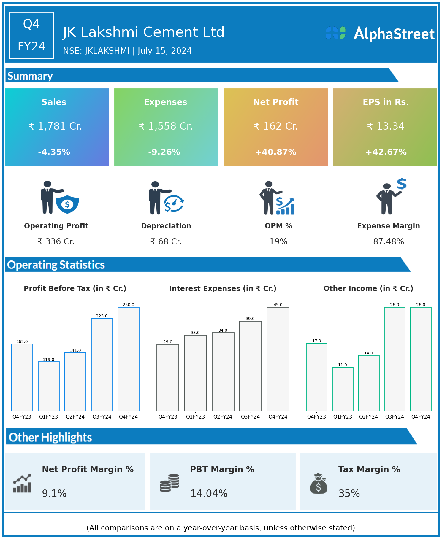 JK Lakshmi Cement Ltd reported Revenues for Q4FY24 of ₹1,781.00 Crores down from ₹1,862.00 Crore year on year, a fall of 4.35%.