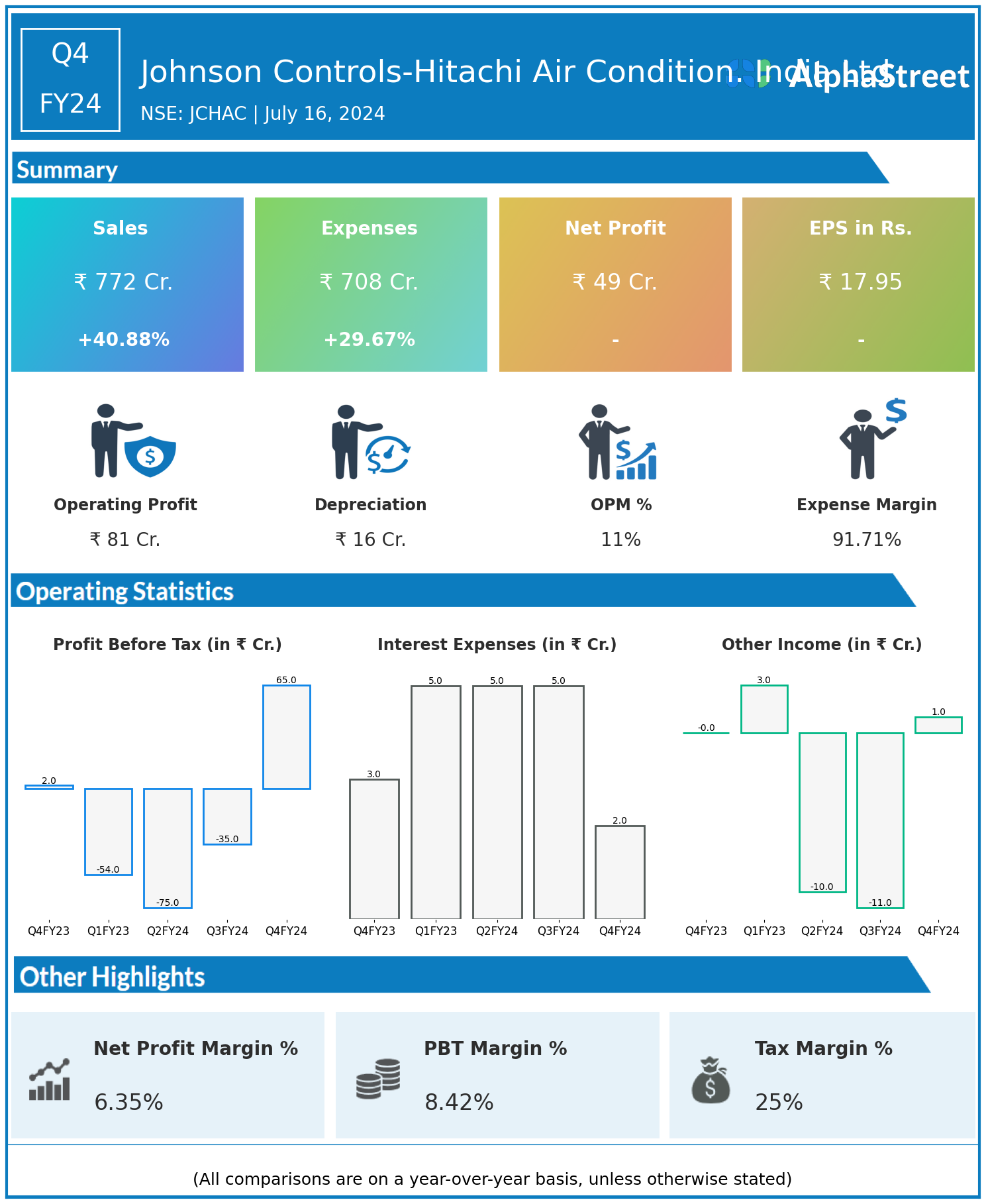 Johnson Controls-Hitachi Air Condition. India Ltd reported Revenues for Q4FY24 of ₹772.00 Crores up from ₹548.00 Crore year on year, a rise of 40.88%.