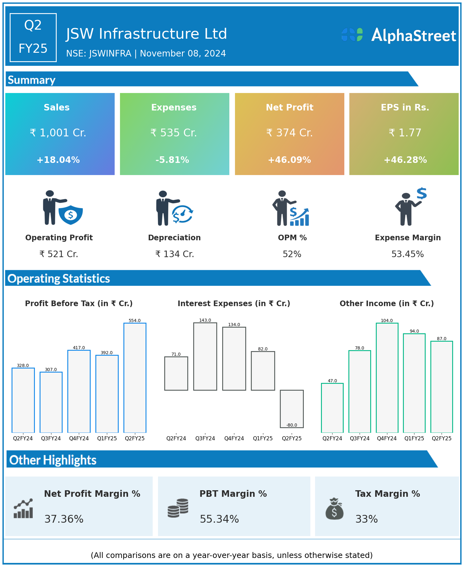 JSW Infrastructure Ltd reported Revenues for Q2FY25 of ₹1,001.00 Crores up from ₹848.00 Crore year on year, a rise of 18.04%.