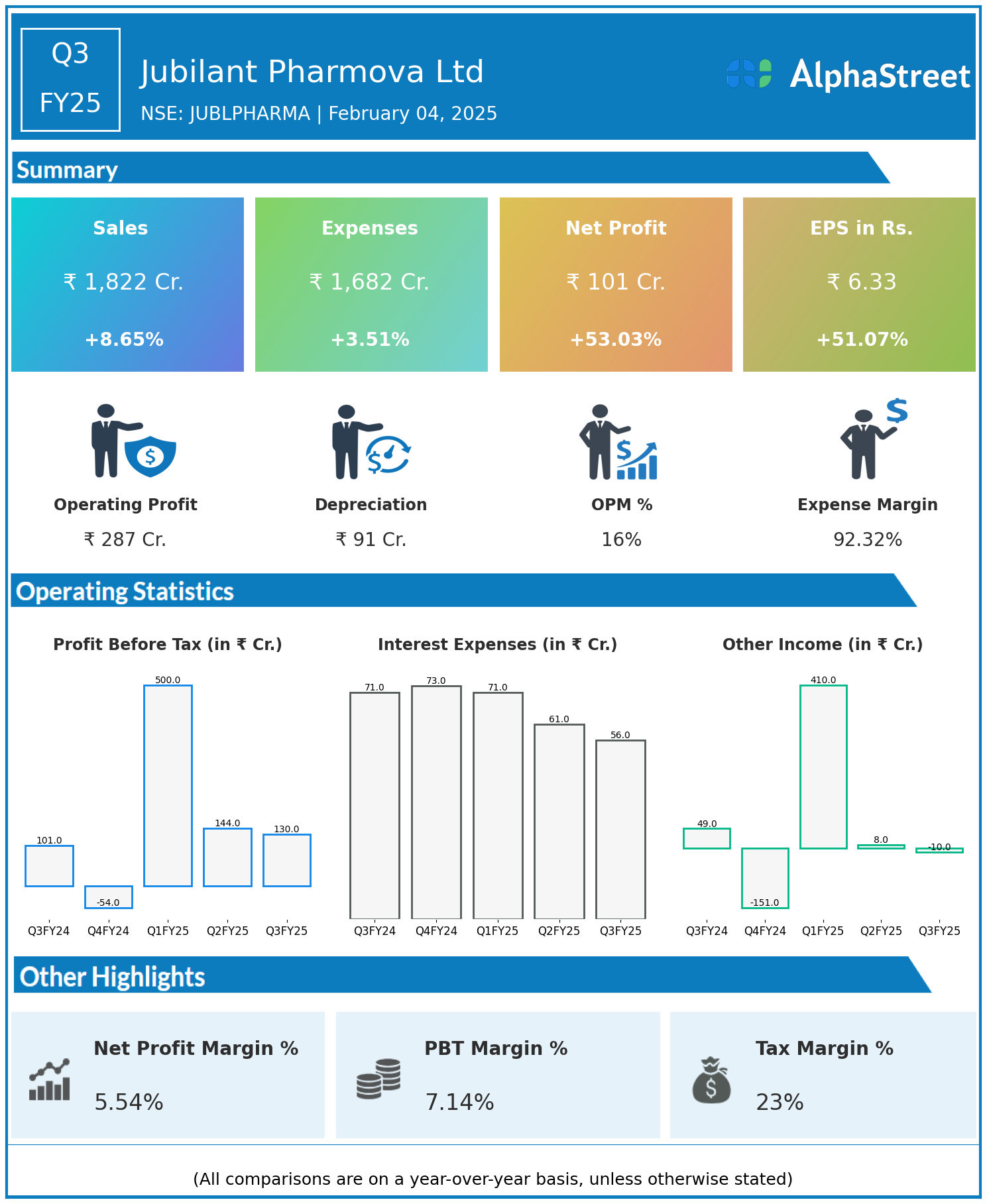 Jubilant Pharmova Ltd reported Revenues for Q3FY25 of ₹1,822.00 Crores up from ₹1,677.00 Crore year on year, a rise of 8.65%.