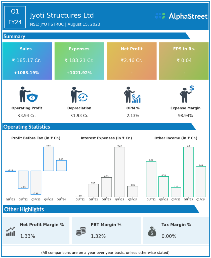 - Jyoti Structures Ltd reported Revenues for Q1FY24 of ₹185.17 Crores up from ₹15.65 Crore year on year, a rise of 1083.19%.