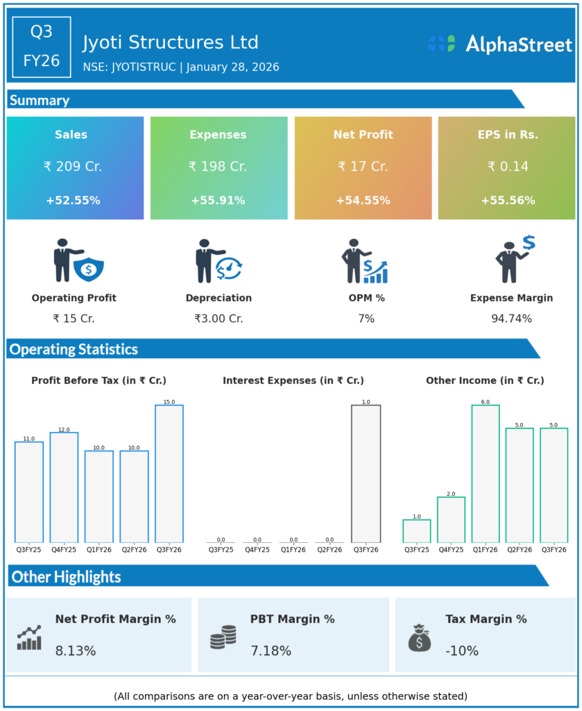 Jyoti Structures Ltd reported Q3FY26 revenues of ₹209 crore, up 52.55% YoY, with consolidated net profit rising 54.55% to ₹17 crore. Total expenses increased 55.91% YoY to ₹198 crore, reflecting strong revenue growth with proportional cost scaling.