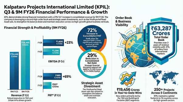 Kalpataru Projects International Limited (NSE: KPIL), the global engineering firm, announced solid quarterly results supported by robust order inflows and the completion of highway asset divestments, despite margin constraints in its water and Brazilian operations. Management confirmed the company remains on track to achieve its full-year growth and profitability targets while strengthening the balance sheet.