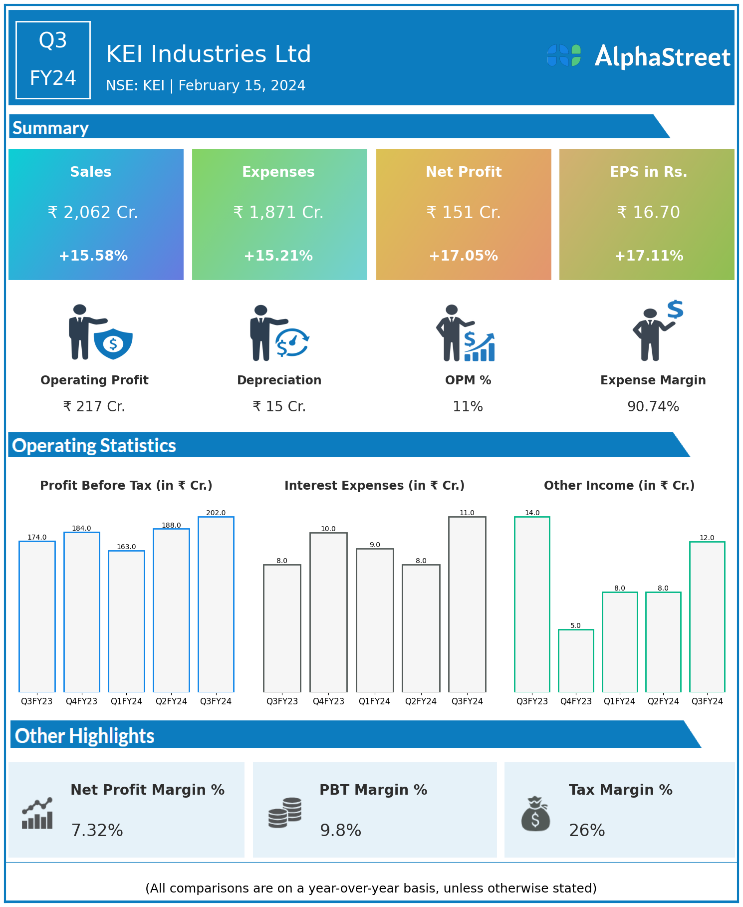 KEI Industries Ltd reported Revenues for Q3FY24 of ₹2,062.00 Crores up from ₹1,784.00 Crore year on year, a rise of 15.58%.
