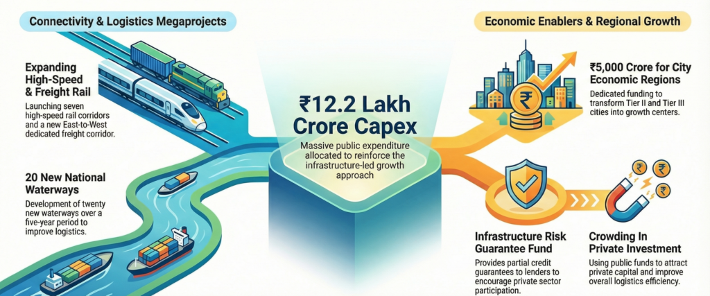 Public capital expenditure has been increased to ₹12.2 lakh crore, reinforcing the government’s infrastructure-led growth approach. Key initiatives include: